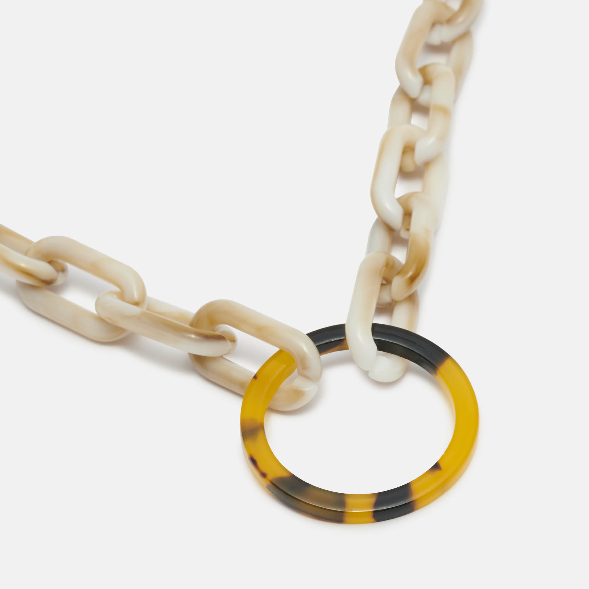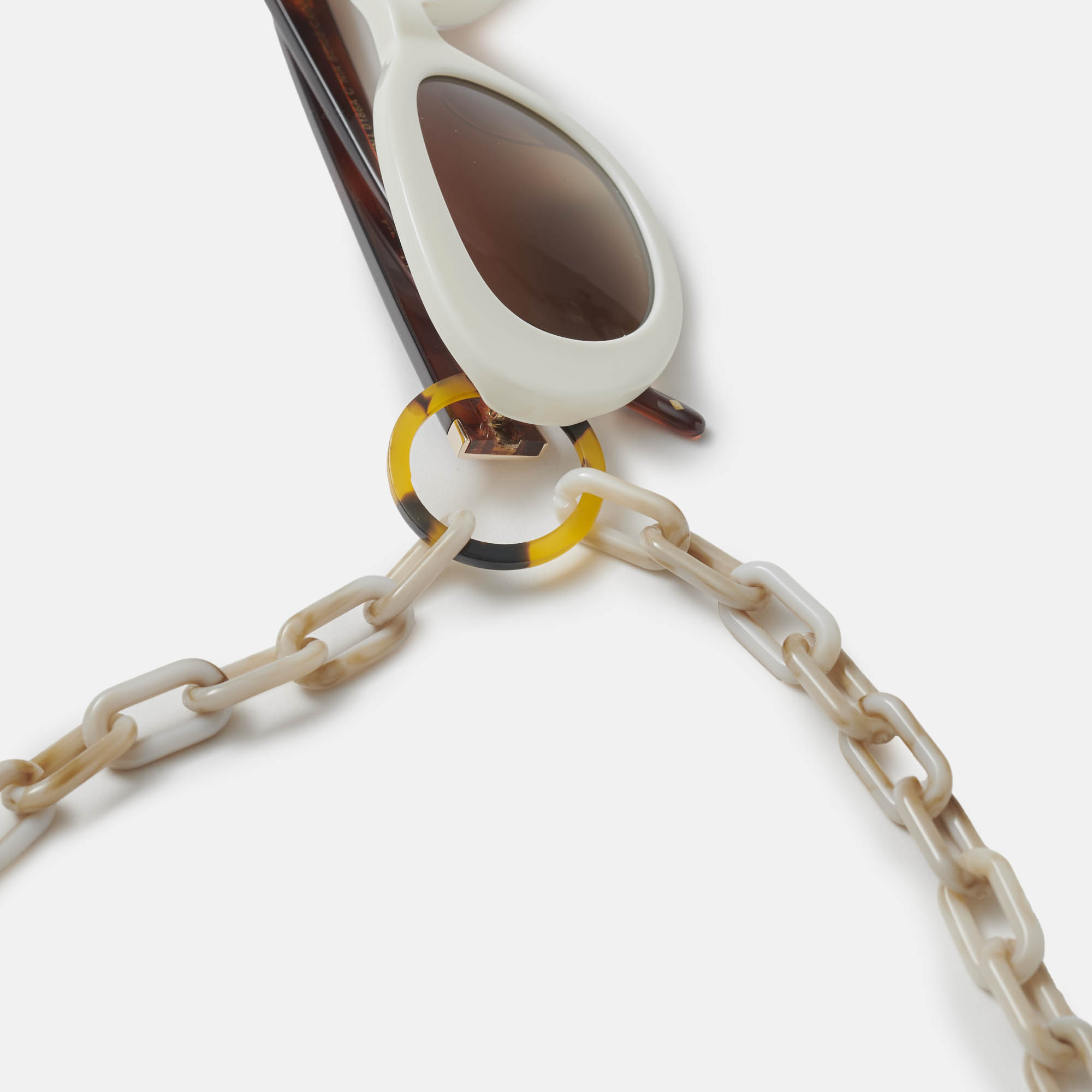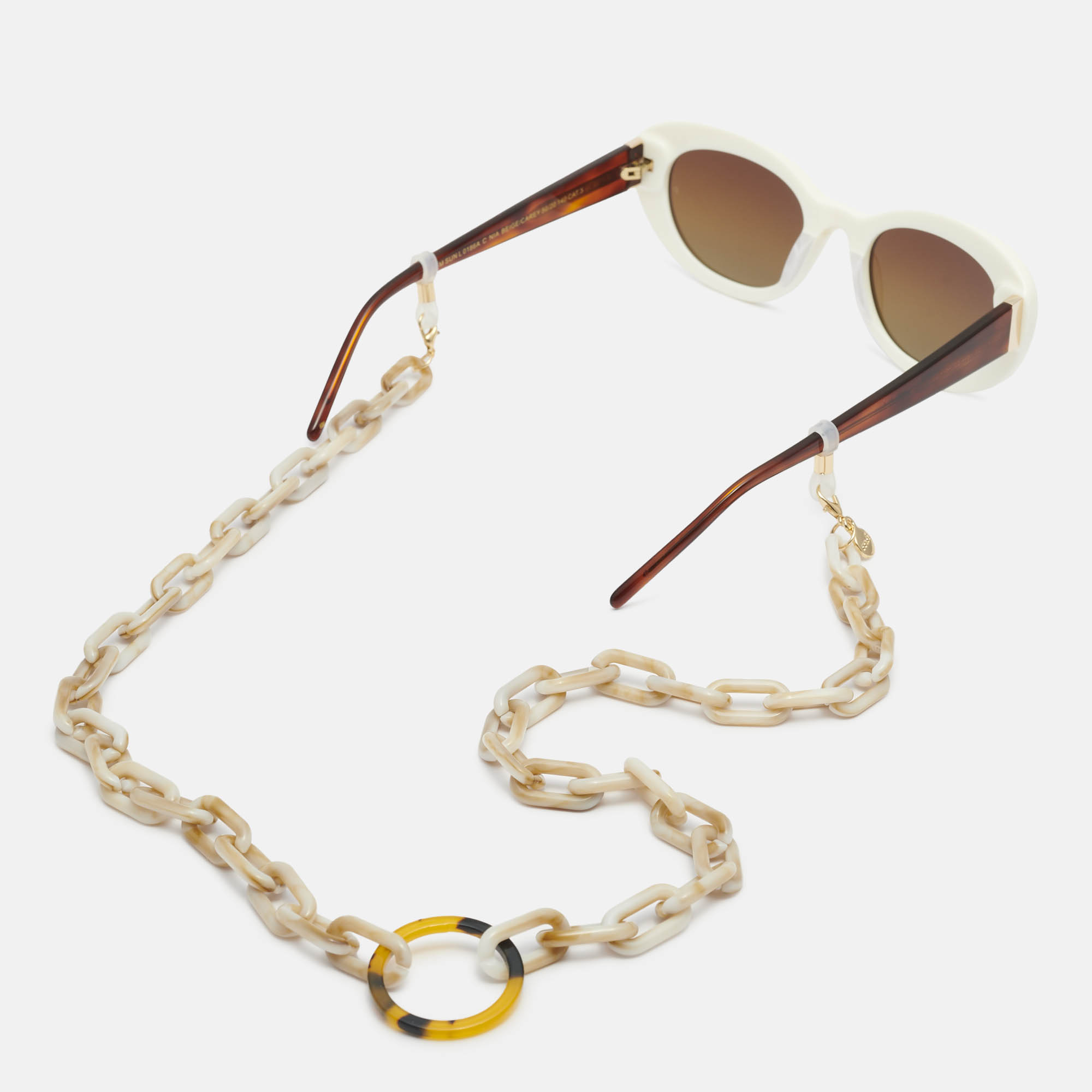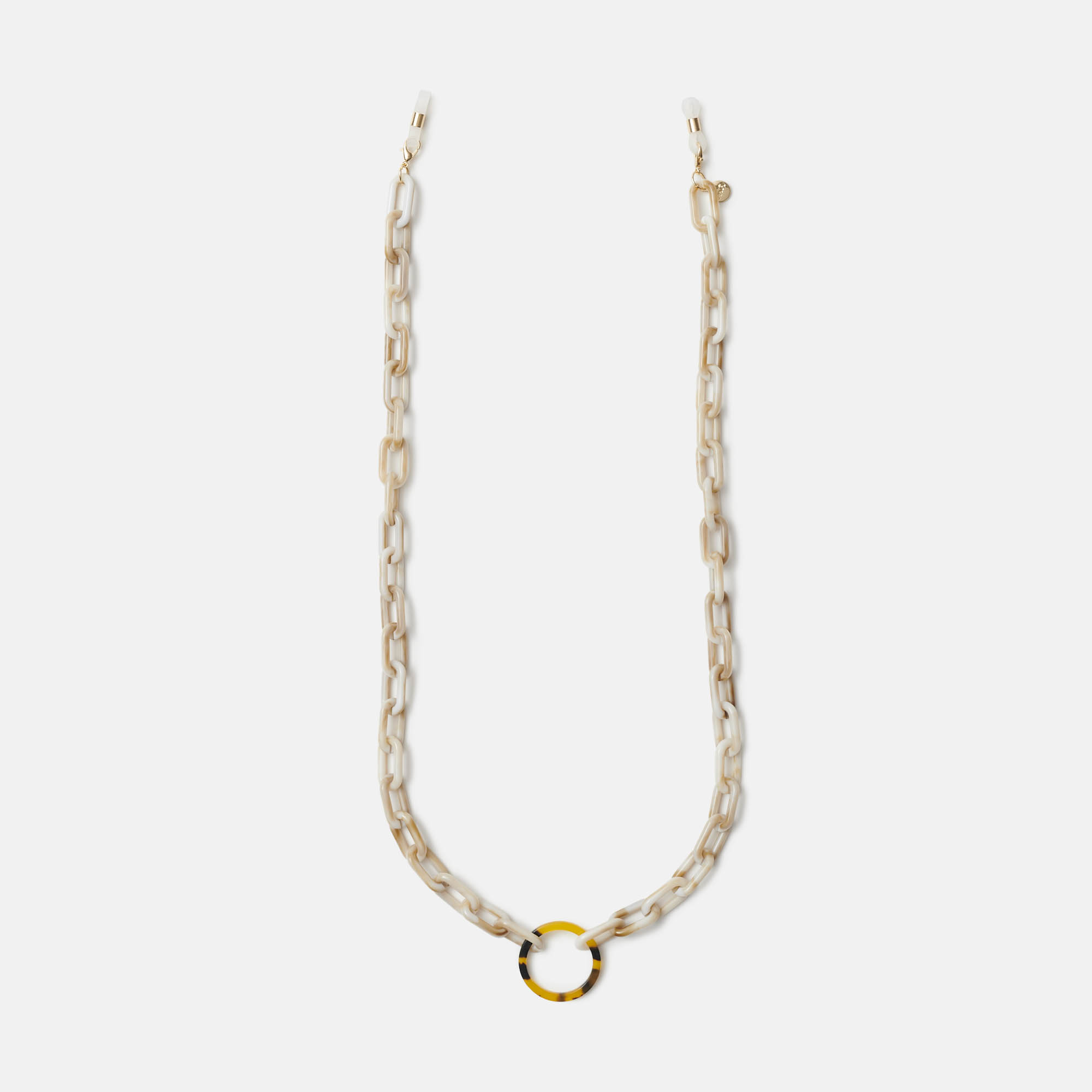 Exclusiva cadena de mujer con eslabones de color beige y anilla central para colgar las gafas. Gracias a su elegante diseño y su practicidad, combina con cualquier tipo de gafa, tanto de ver como de sol. Largo total: 70 cm.
