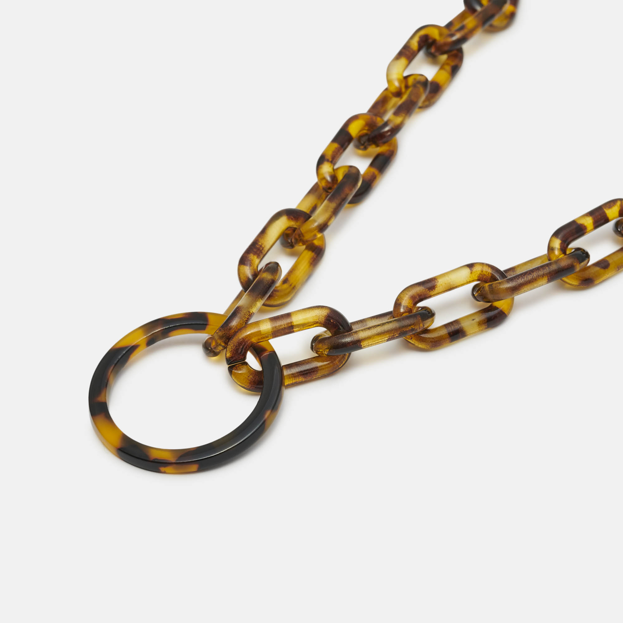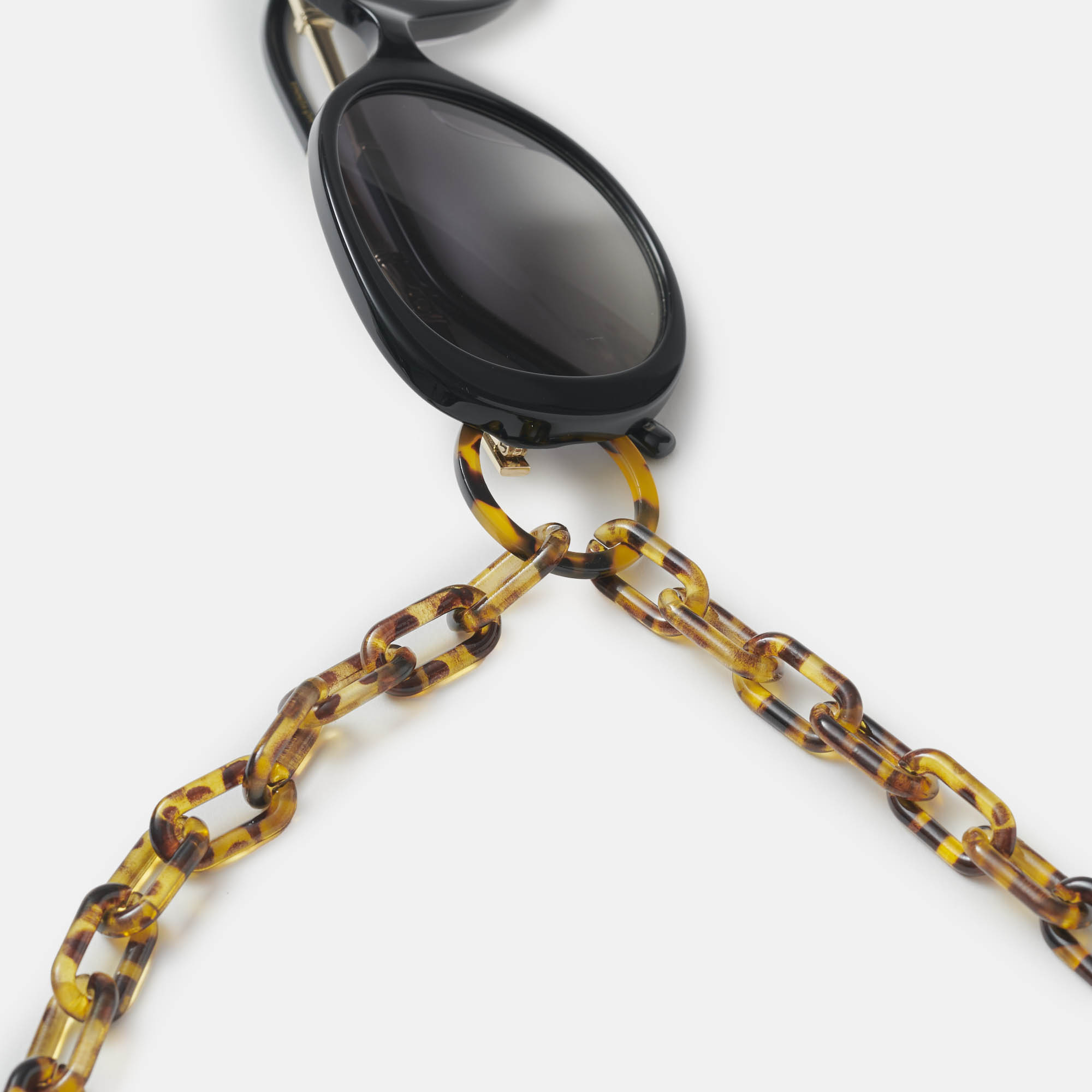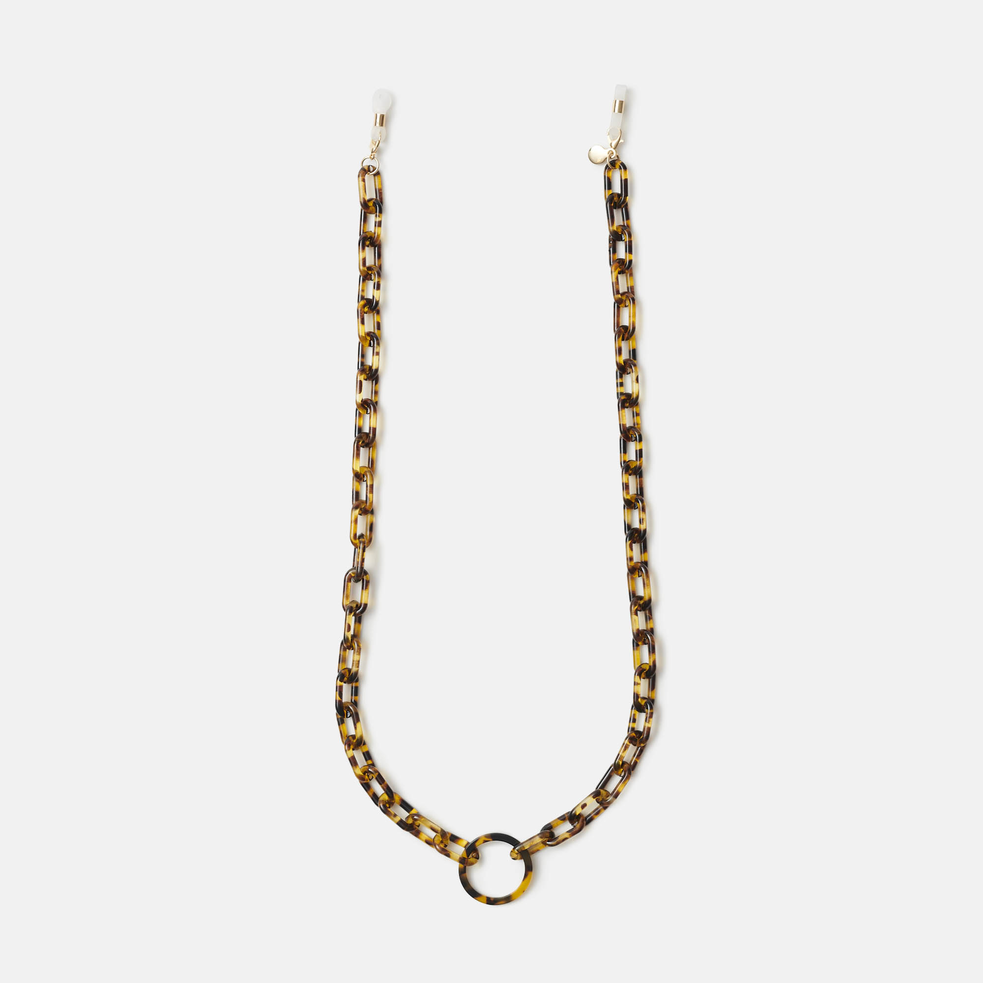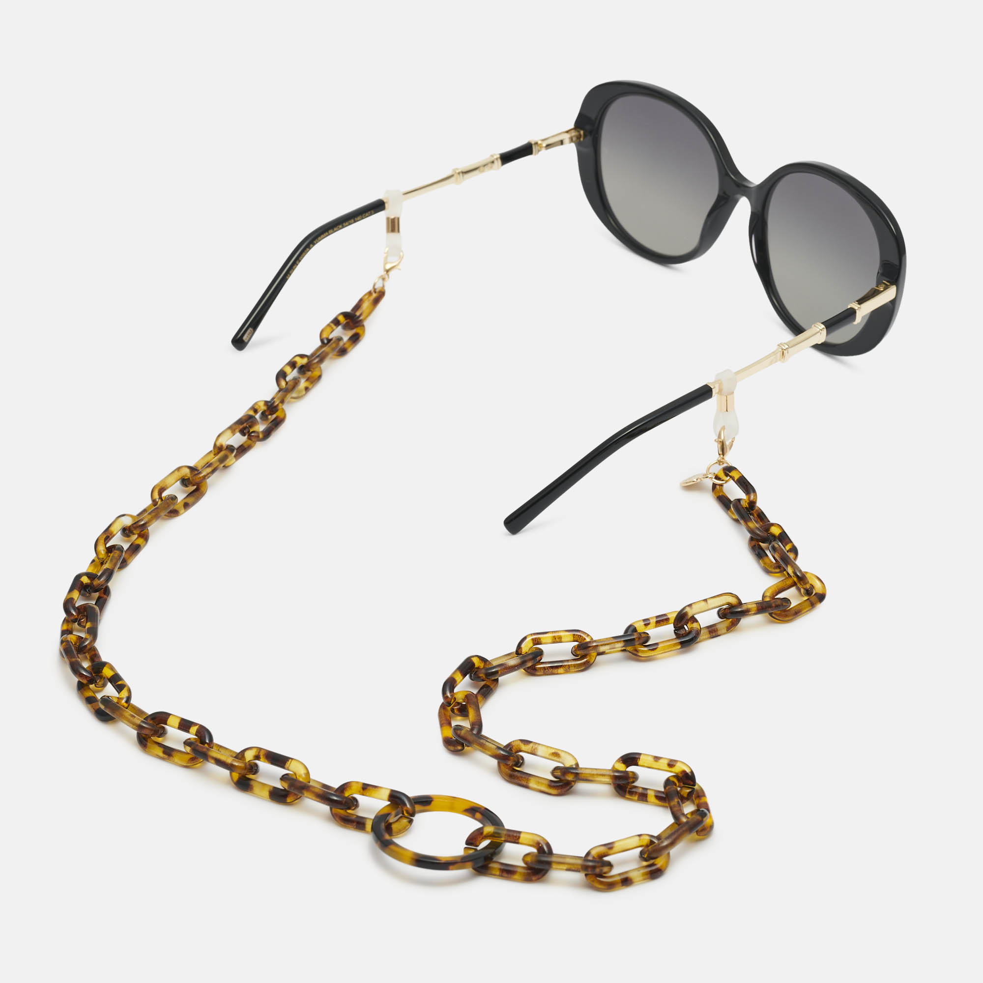 Exclusiva cadena de mujer con eslabones de color carey y anilla central para colgar las gafas. Gracias a su elegante diseño y su practicidad, combina con cualquier tipo de gafa, tanto de ver como de sol. Largo total: 70 cm.