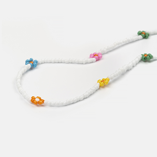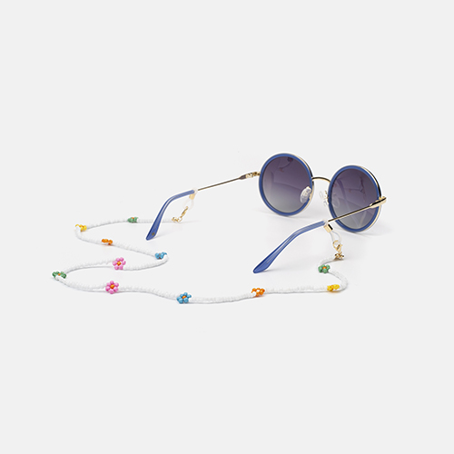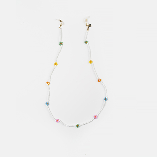 Cordón de abalorios acrílicos de colores en forma de flor, para un look desenfadado y alegre, cuenta con cabezales ajustables. Gracias a su elegante diseño, combina con cualquier tipo de gafa, tanto de ver como de sol.Además de cuelga gafas, también se puede lucir como accesorio. Para ello, basta con retirar las gomas de los extremos y usar los mosquetones como cierre de tu nueva pulsera o collar...¡Aprovecha todas sus posibilidades!