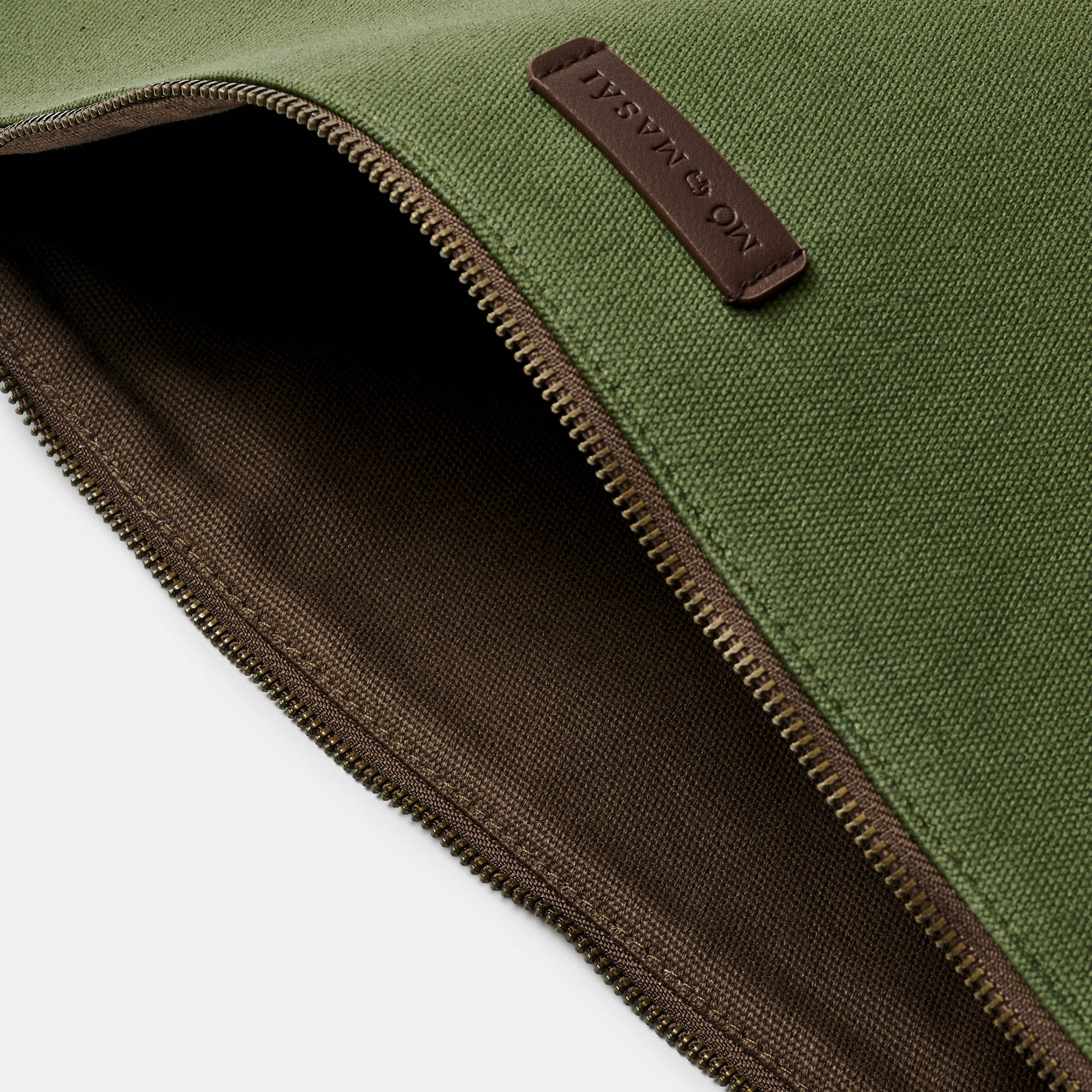 Funda rectangular para ordenador verde y detalles en marrón. Confeccionado en algodón y cierre con cremallera. Dimensiones: 42*30cm.