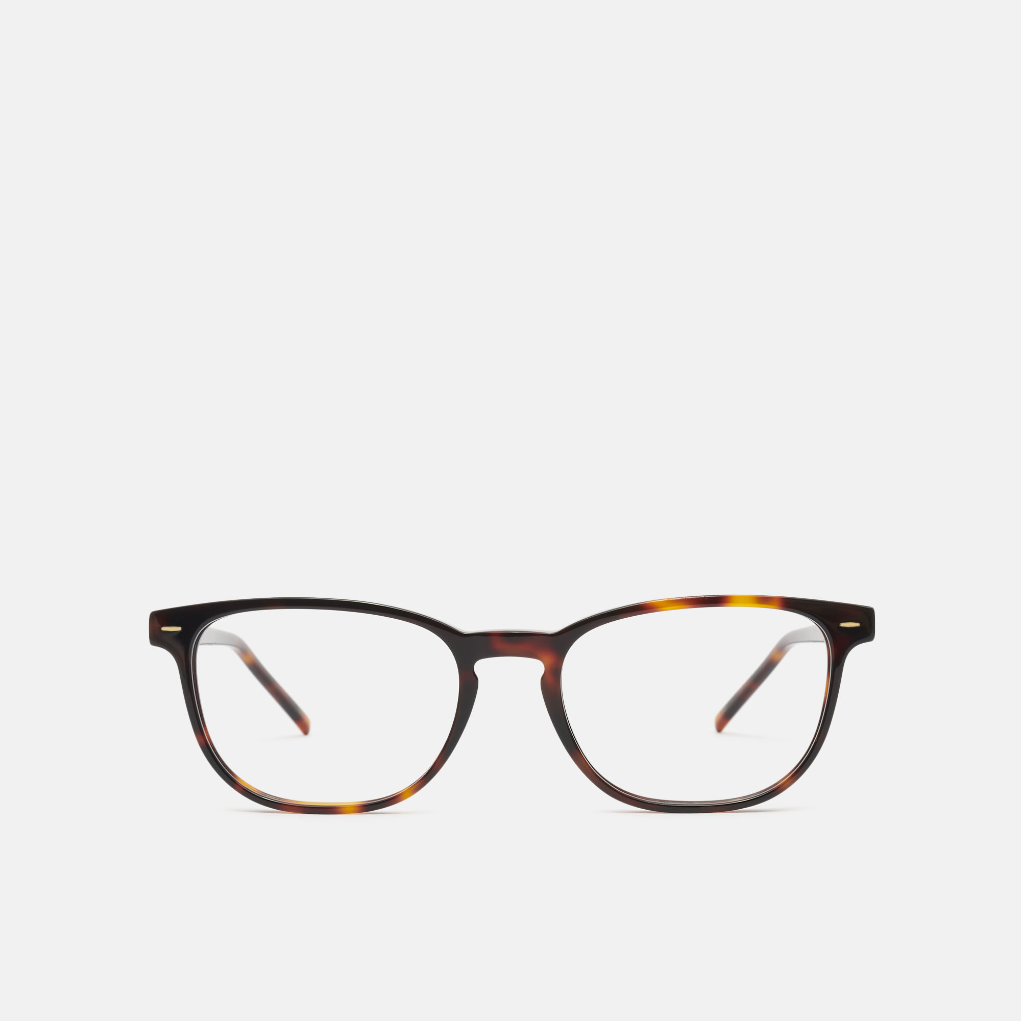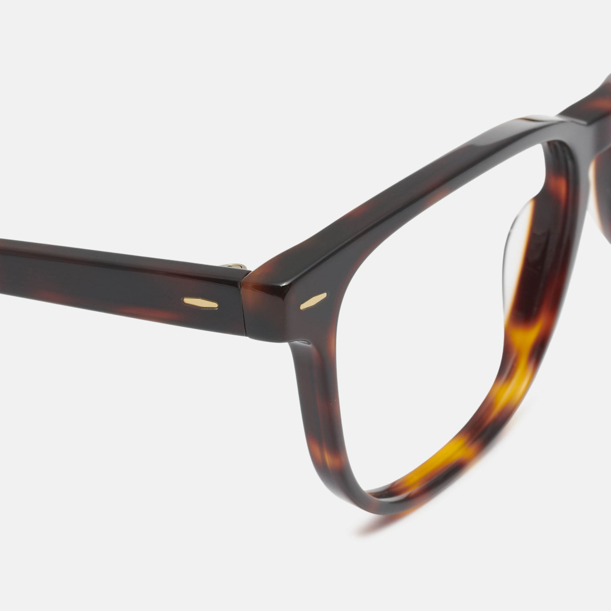 Gafas de ver para hombre con montura rectangular, fabricadas en acetato de color carey, que evocan al estilo clásico pero contemporáneo. Destacan los detalles metálicos en color dorado enel frente y en la varilla, y el toque metálico interior con grabado único.