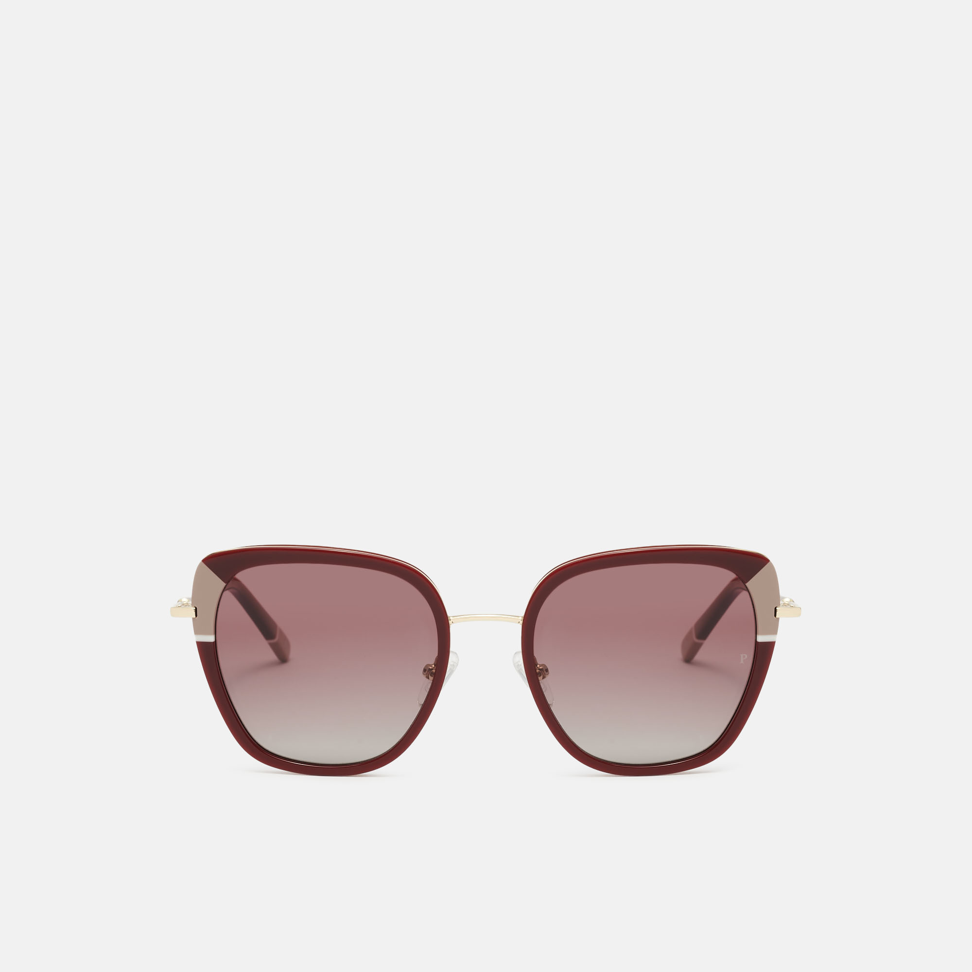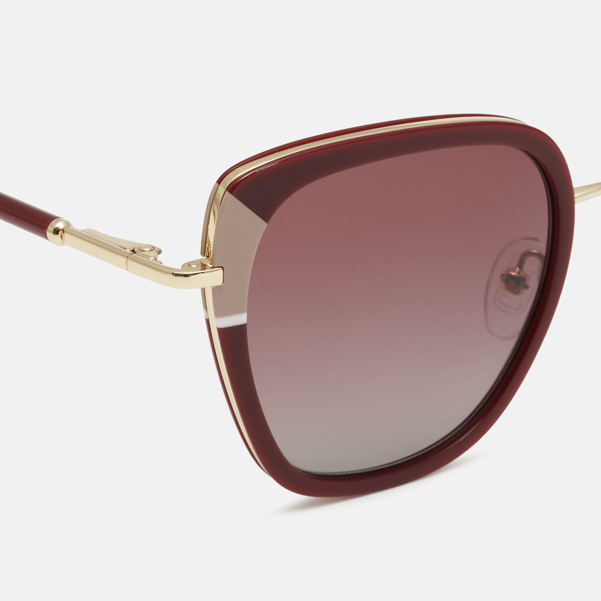 Gafas de sol de acetato burdeos con forma cat-eye y detalles de colores en frente y varillas. Sus lentes rosas degradadas polarizadas de alta calidad, proporcionan una visión más nítida y un mejor contraste.