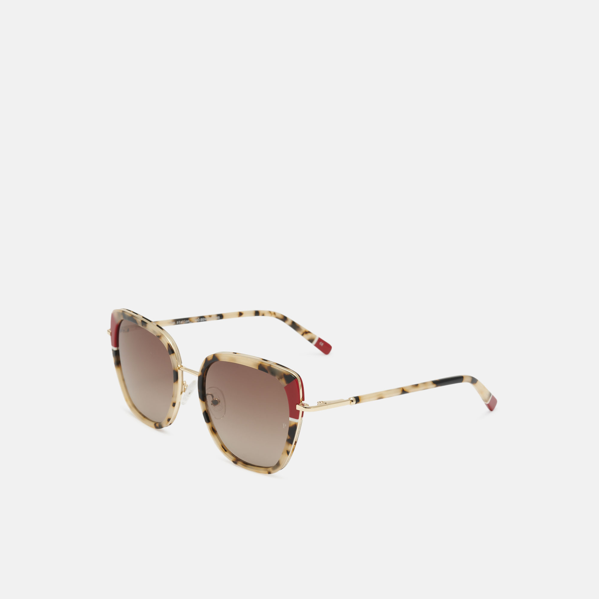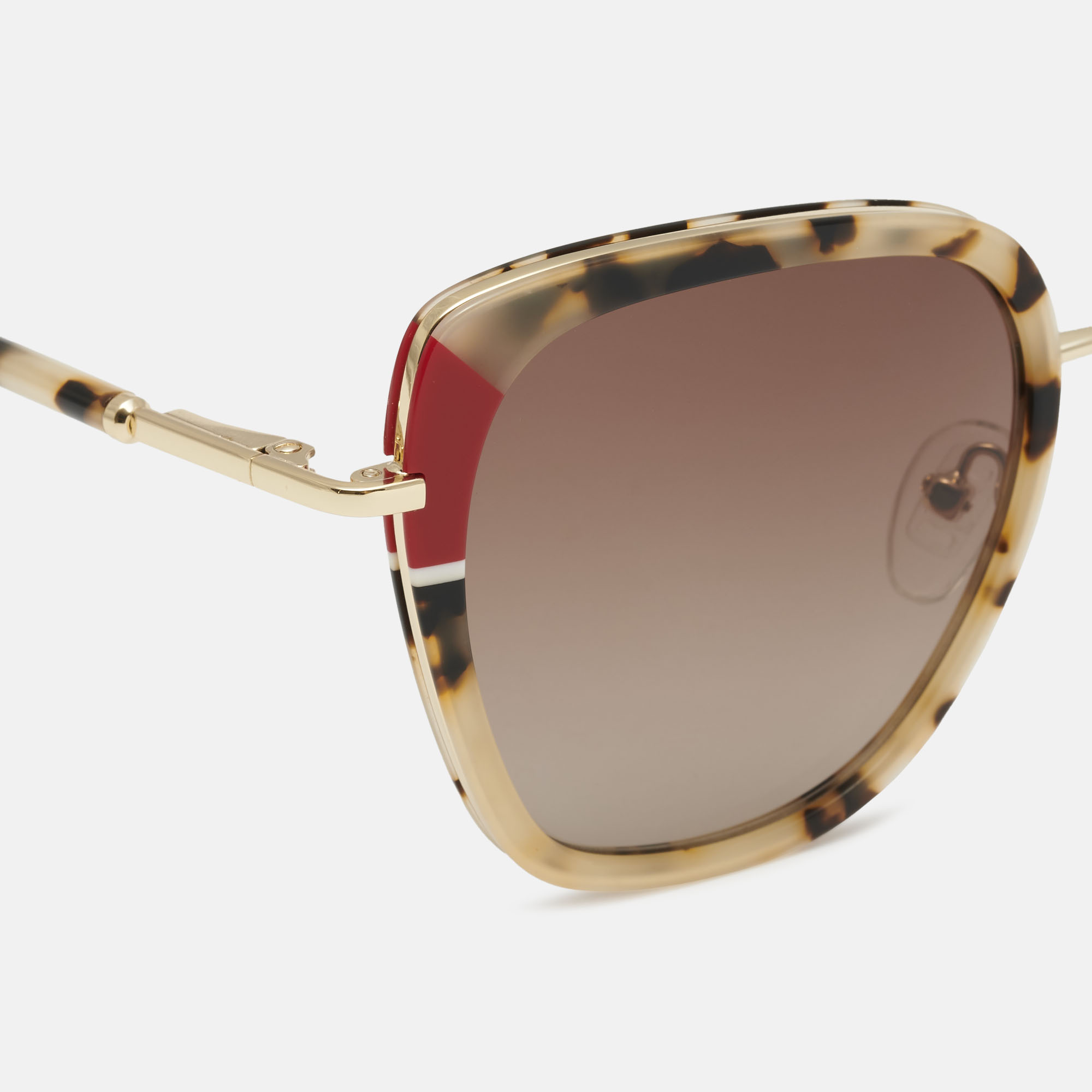 Gafas de sol de acetato veteado blanco con forma "cat-eye" y detalles de colores en frente y varillas. Sus lentes marrones degradadas polarizadas de alta calidad, proporcionan una visión más nítida y un mejor contraste.