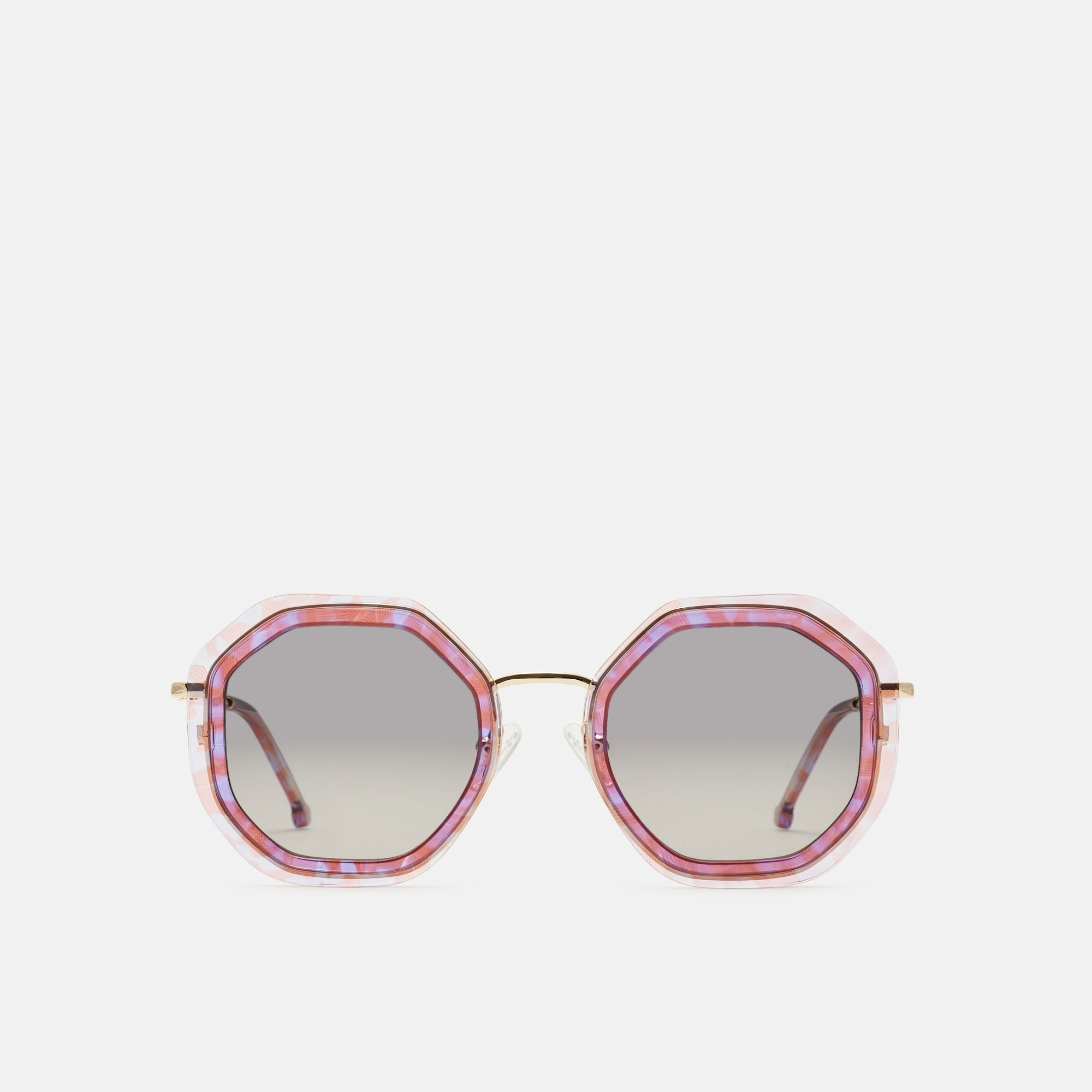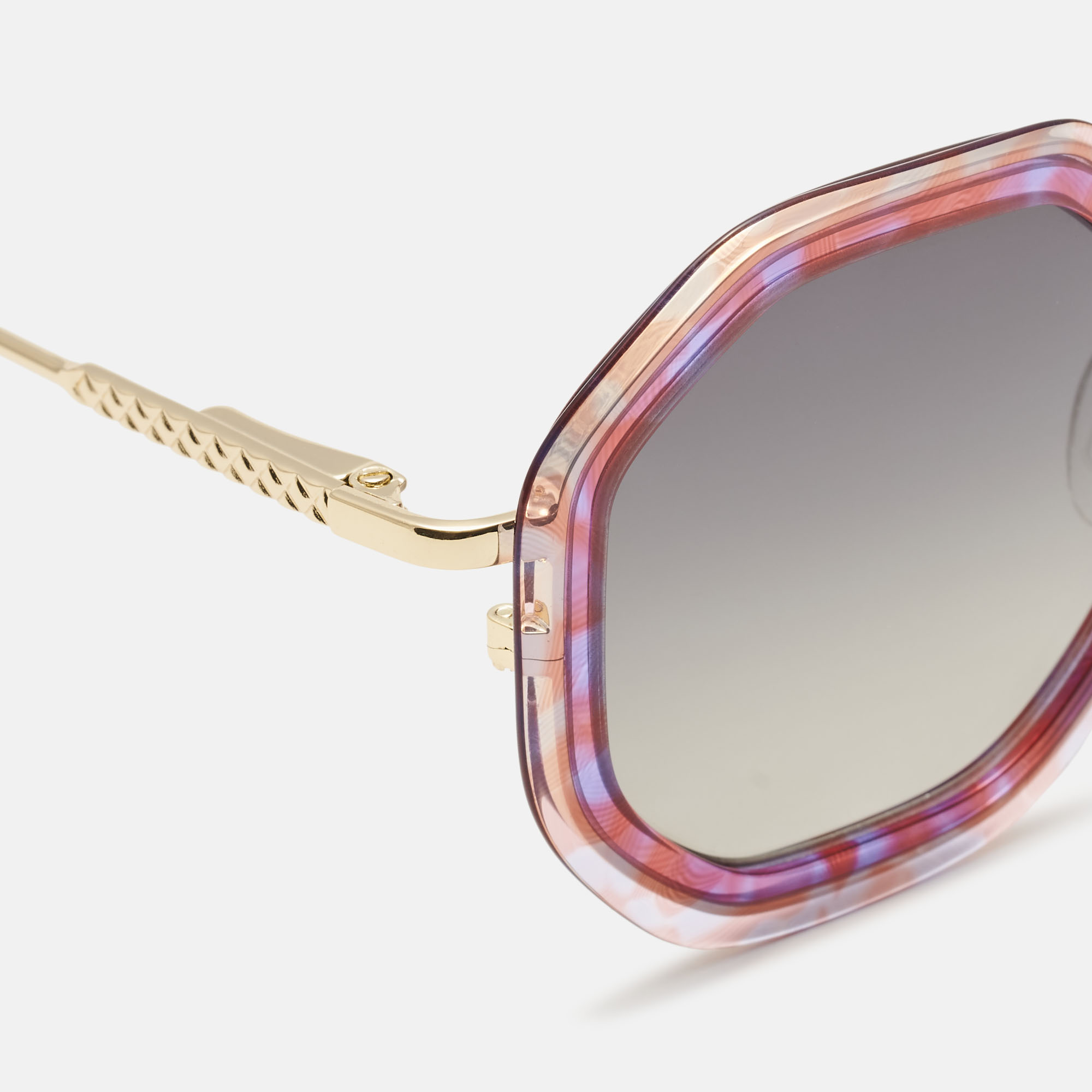 Gafas geométricas, para mujer, de acetato morado veteado, destaca su estructura metálica dorada, y sus varillas con textura. Sus lentes grises degradadas polarizadas de alta calidad, proporcionan una visión más nítida y un mejor contraste.