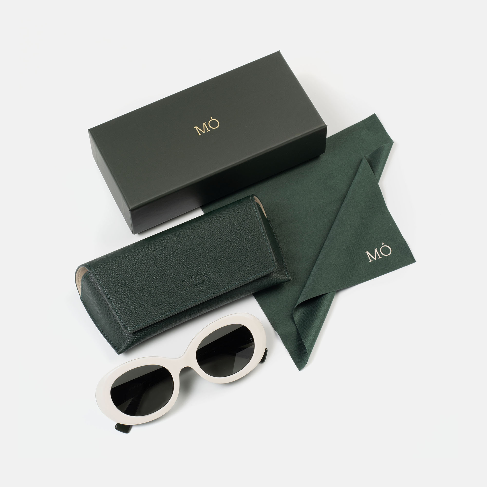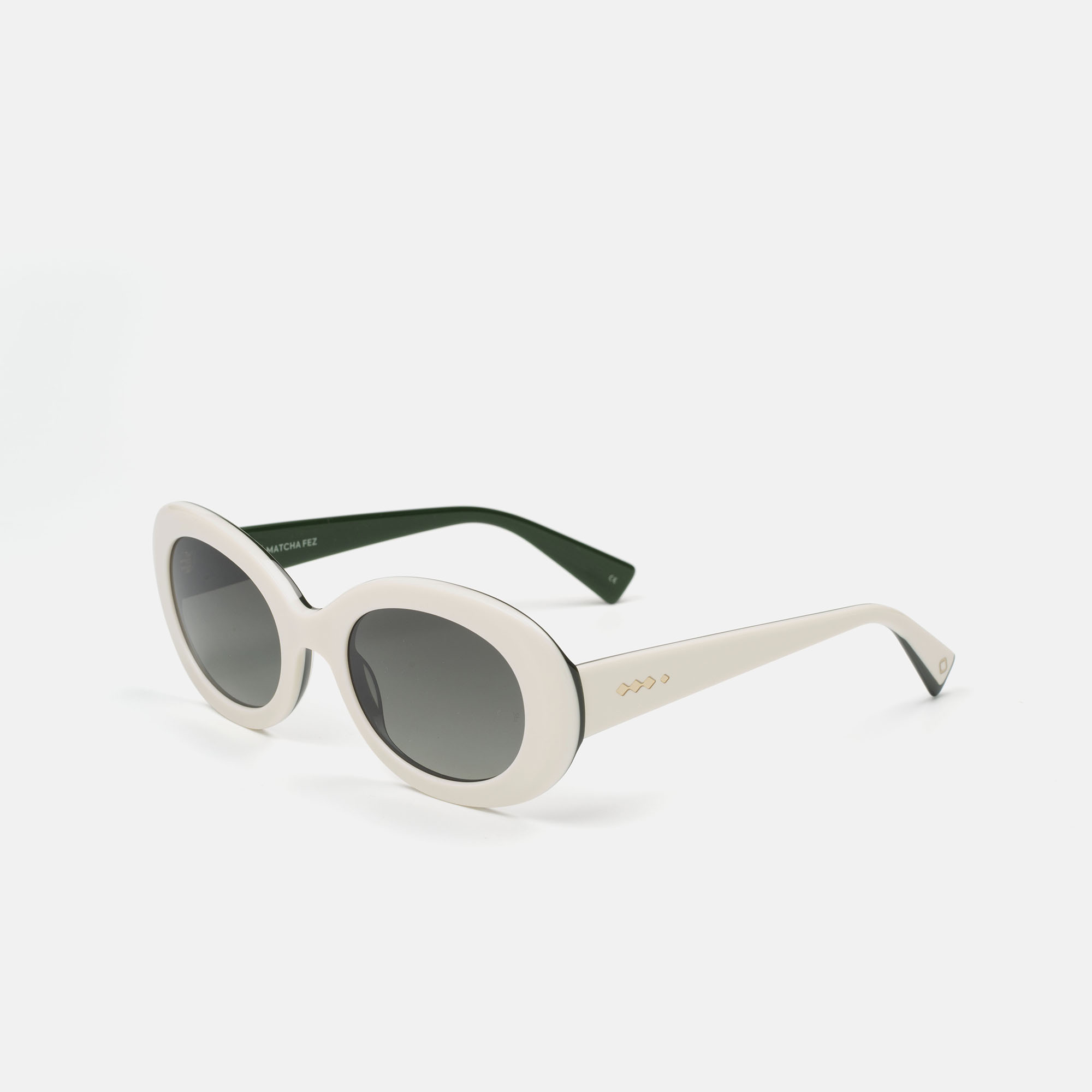 Gafas de sol para mujer, con forma redonda minimalista, de acetato beige en el exterior y verde en el interior con varilla ancha adornada con detalle metálico dorado. Sus lentes verdes degradadas de alta calidad son polarizadas, para una mejor protección y confort.