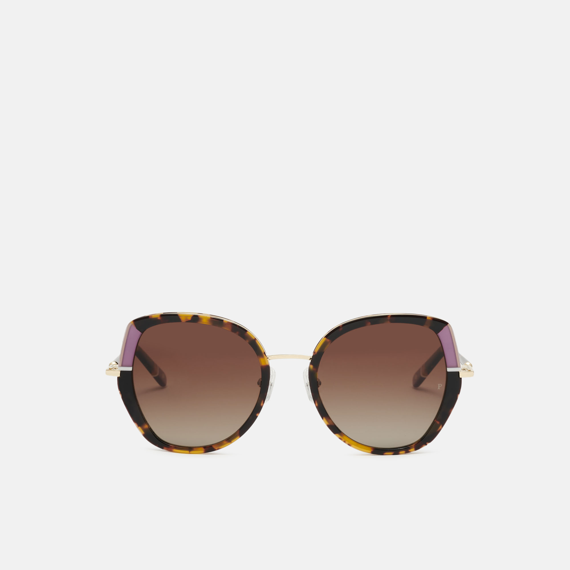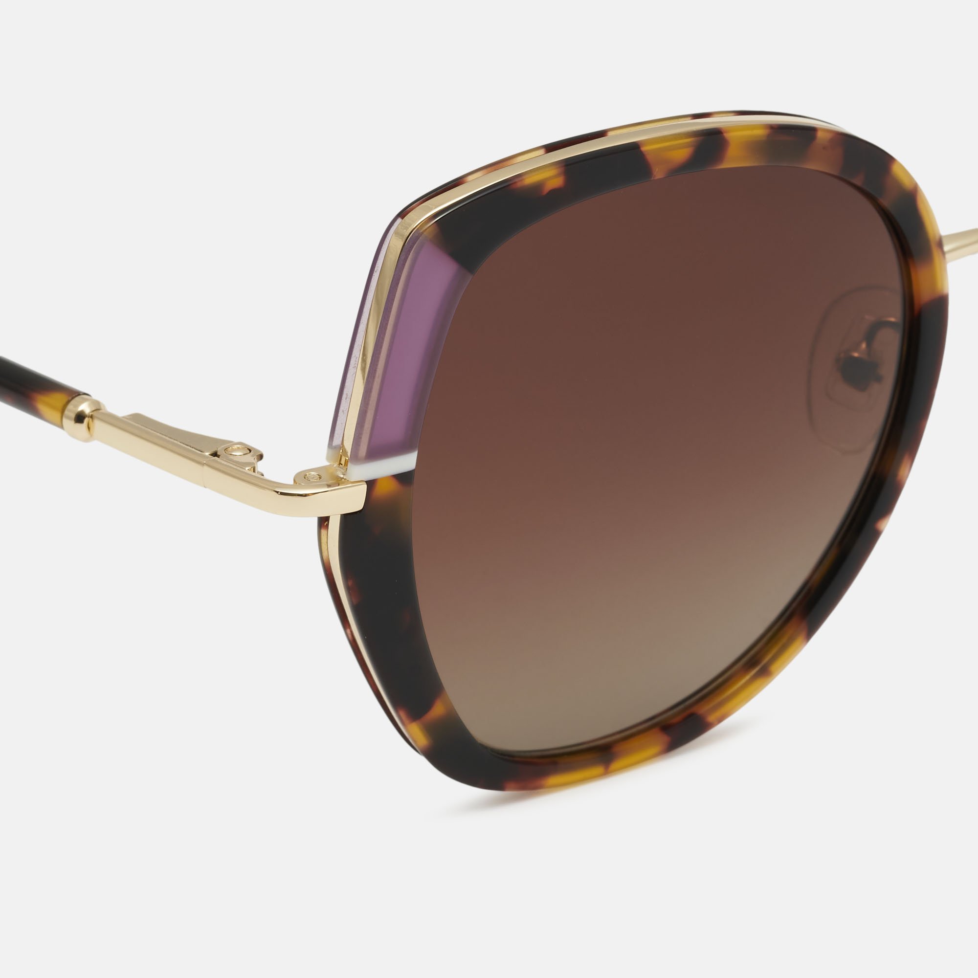 Gafas de sol de acetato carey con forma geométrica "oversize" y detalles de colores en frente y varillas. Sus lentes marrones degradadas polarizadas de alta calidad, proporcionan una visión más nítida y un mejor contraste.
