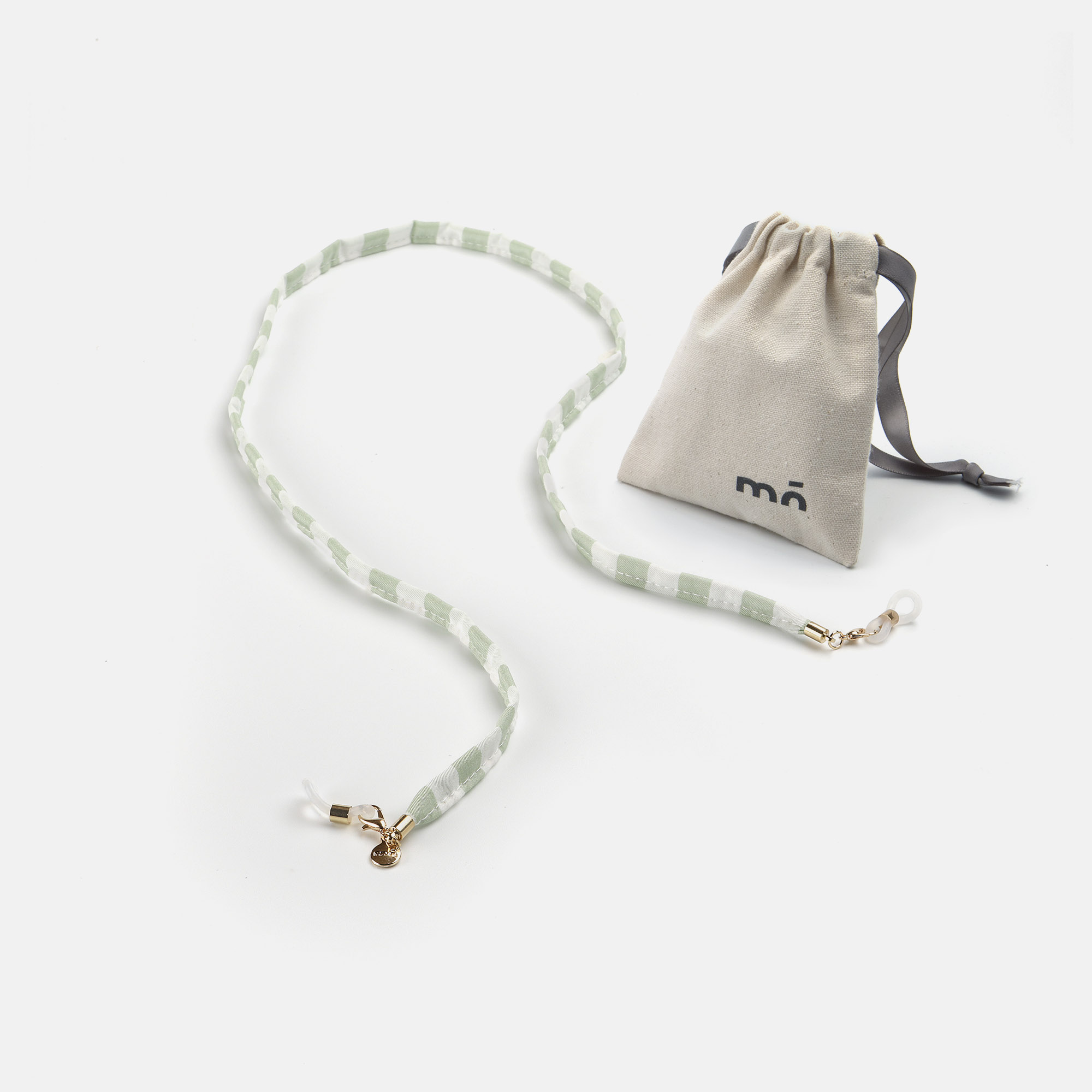 Cordón plano de tela con estampado de cuadros vichy en tono verde para colgar tus gafas mó. También se puede lucir como "choker" o pulsera gracias a los mosquetones que incorpora.