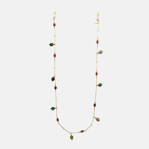 Cadena exclusiva diseñada con piedras naturales, un accesorio elegante muy en línea con las tendencias de moda actuales. Cuenta con cabezales ajustables que se adaptan a cualquier tipo de gafa, tanto de ver como de sol.Además de cuelga gafas, también se puede lucir como accesorio. Para ello, basta con retirar las gomas de los extremos y usar los mosquetones como cierre de tu nueva pulsera o collar...¡Aprovecha todas sus posibilidades!
