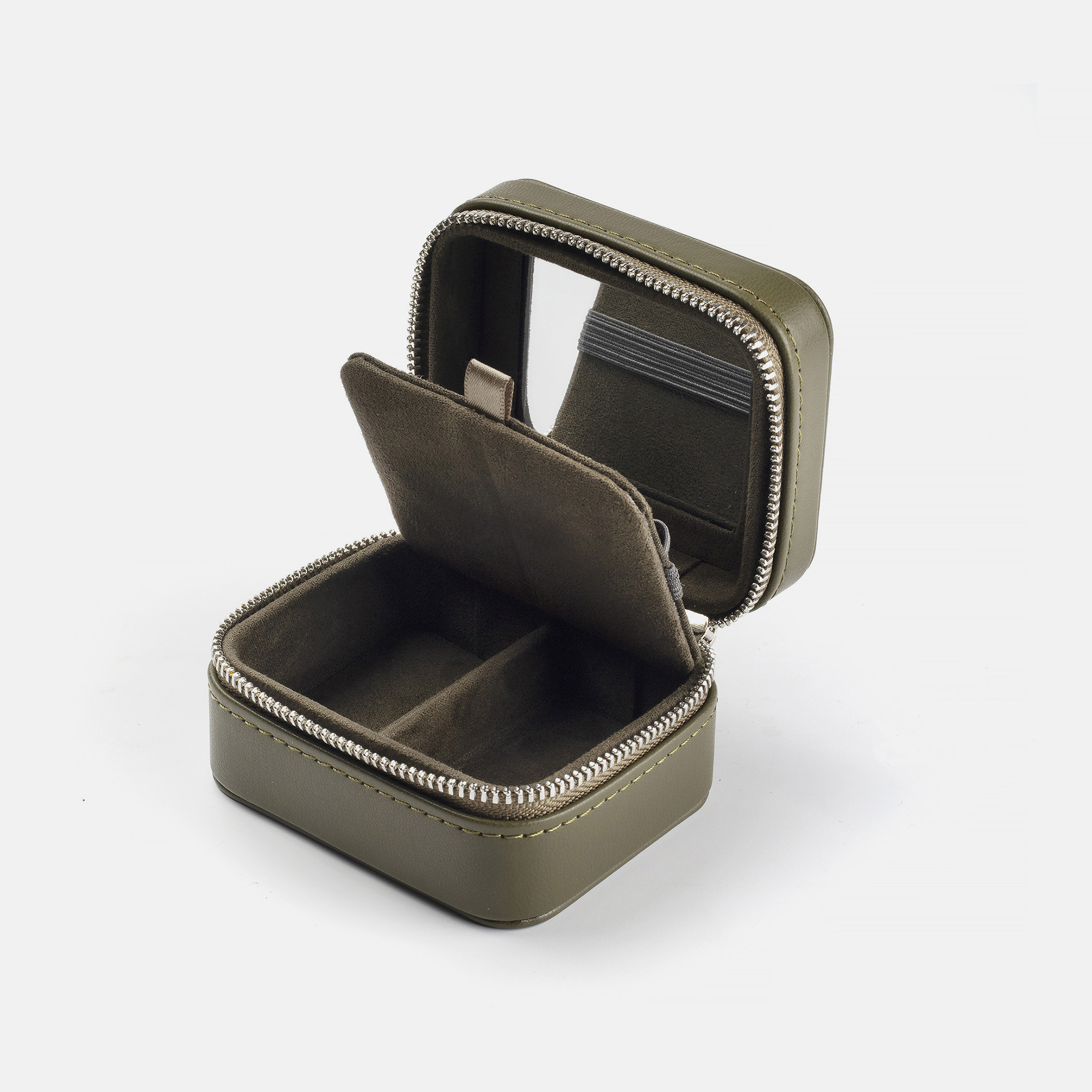 Estuche de audiología en color khaki, con doble compartimento para guardar tus audífonos, cuenta con un espejito, una bandeja para poder llevar las pilas y un compartimento para un peine limpiador. Muy practico para llevar de viaje.