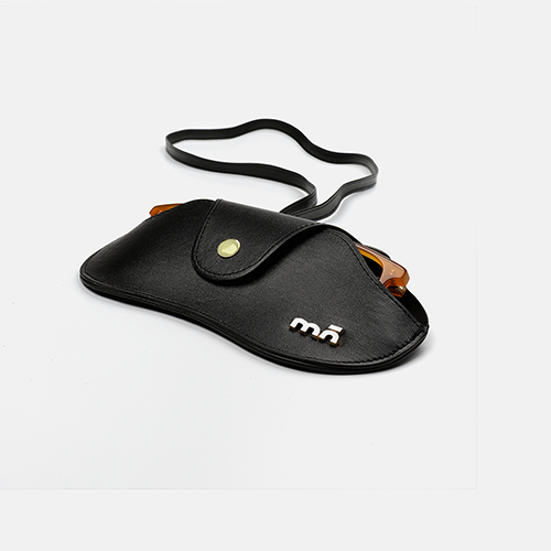 Estuche efecto piel de color negro, perfecto para llevar tus gafas. Dispone de un accesorio para colgarlo al cuello, con una hebilla ajustable puedes adaptarlo a diferentes tamaños. Además, su mosquetón te permite poder engancharlo en cualquier bolso.