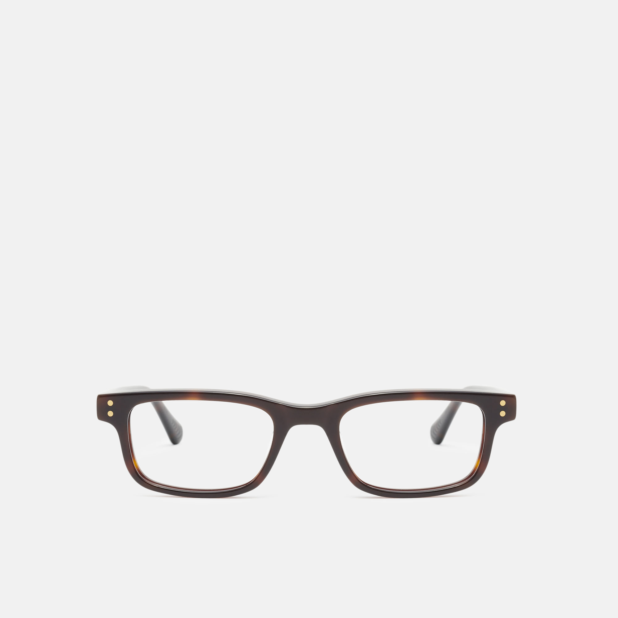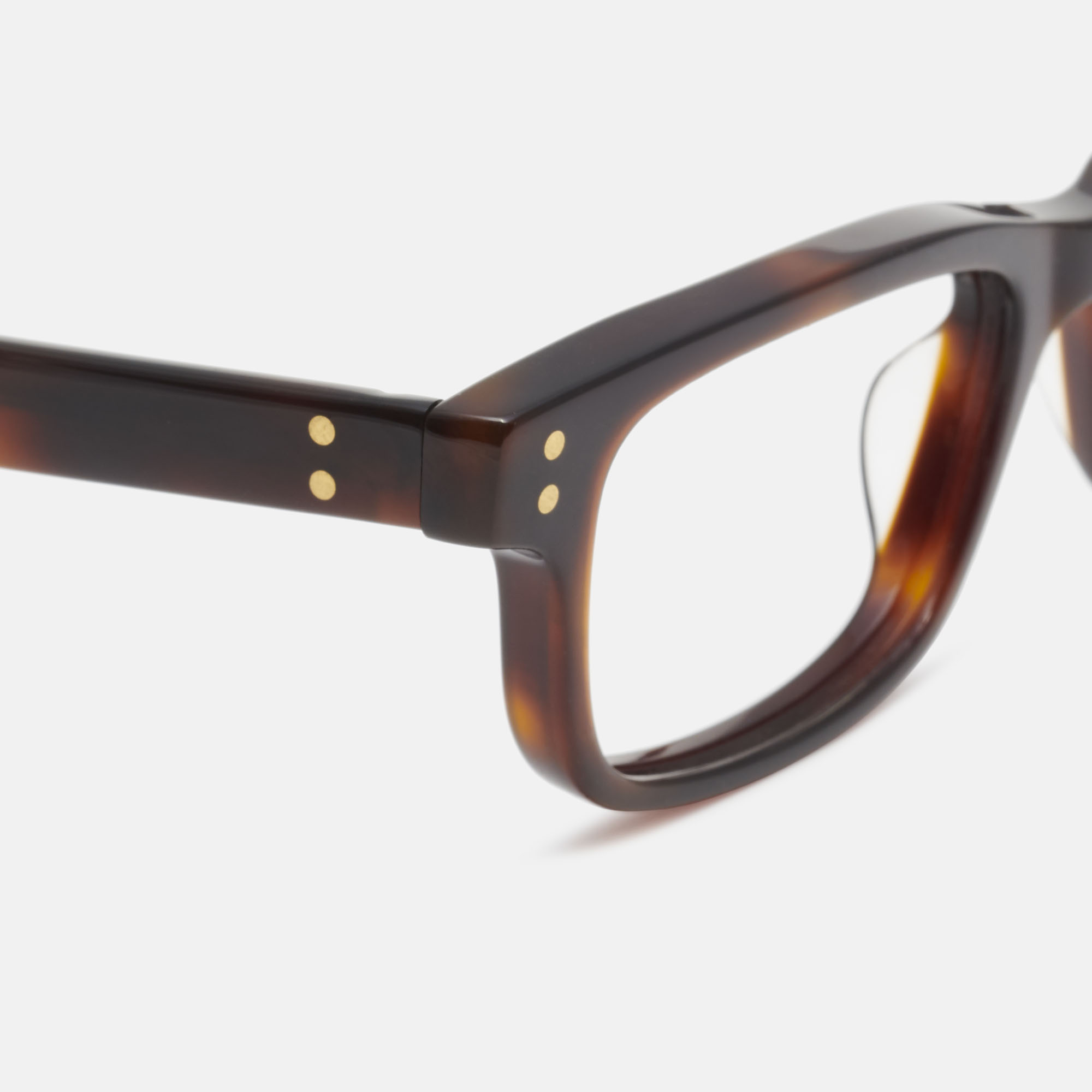 Gafas unisex, con forma rectangular, de acetato "renew"carey y detalles metálicos dorados añadiendo un toque de elegancia a este diseño. Es un modelo diseñado específicamente para graduaciones altas, ya que el espesor de los aros es más grueso. El acetato "renew" es una alternativa más sostenible, está fabricado a base de pulpa de celulosa combinado con plásticos de origen fósil reciclado.