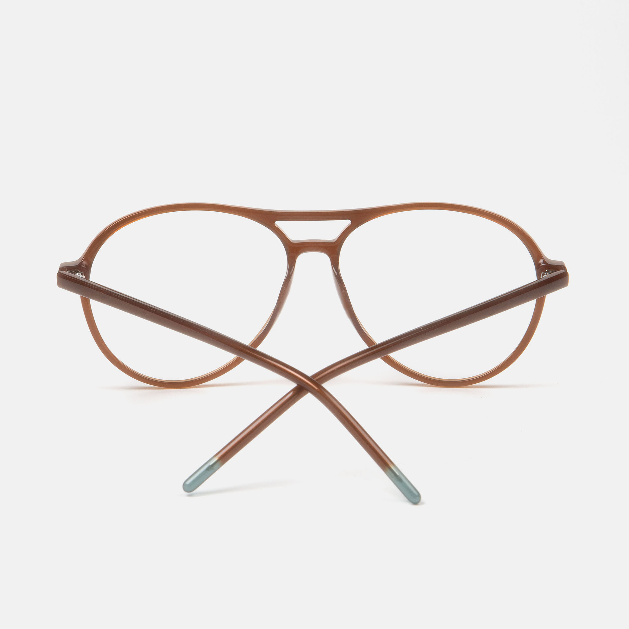 Modelo unisex estilo aviador de acetato ultraligero en color marrón, cn varilla de metal. Cuenta con detalle laminado en el terminal que aporta color a este diseño que combina a la perfección sencillez, atermporalidad y sofisticación.