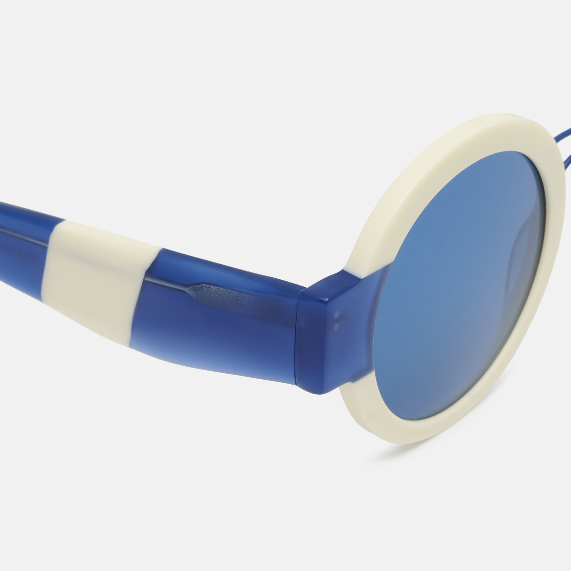 Gafa unisex de forma muy circular y doble puente. Su estilo geométrico, el espesor del acetato y las rayas de colores imprimen carácter a una gafa sofisticada y fresca a partes iguales.