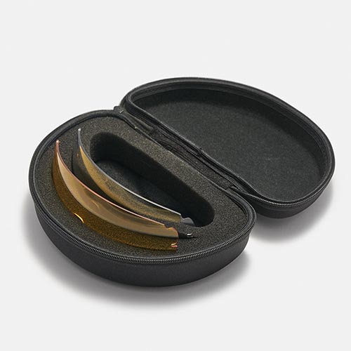 Estuche negro con dos lentes extra para el modelo de gafa Vreni, una de ellas amarilla y otra fotocromática. La lente fotocromática reacciona ante los rayos ultravioletas emitidos por el sol causando el cambio de tonalidad de la lente, oscureciéndose o aclarándose en función de la luz solar que haya en cada momento. Perfecta para actividades al aire libre donde la lente se adaptará a las condiciones lumínicas.