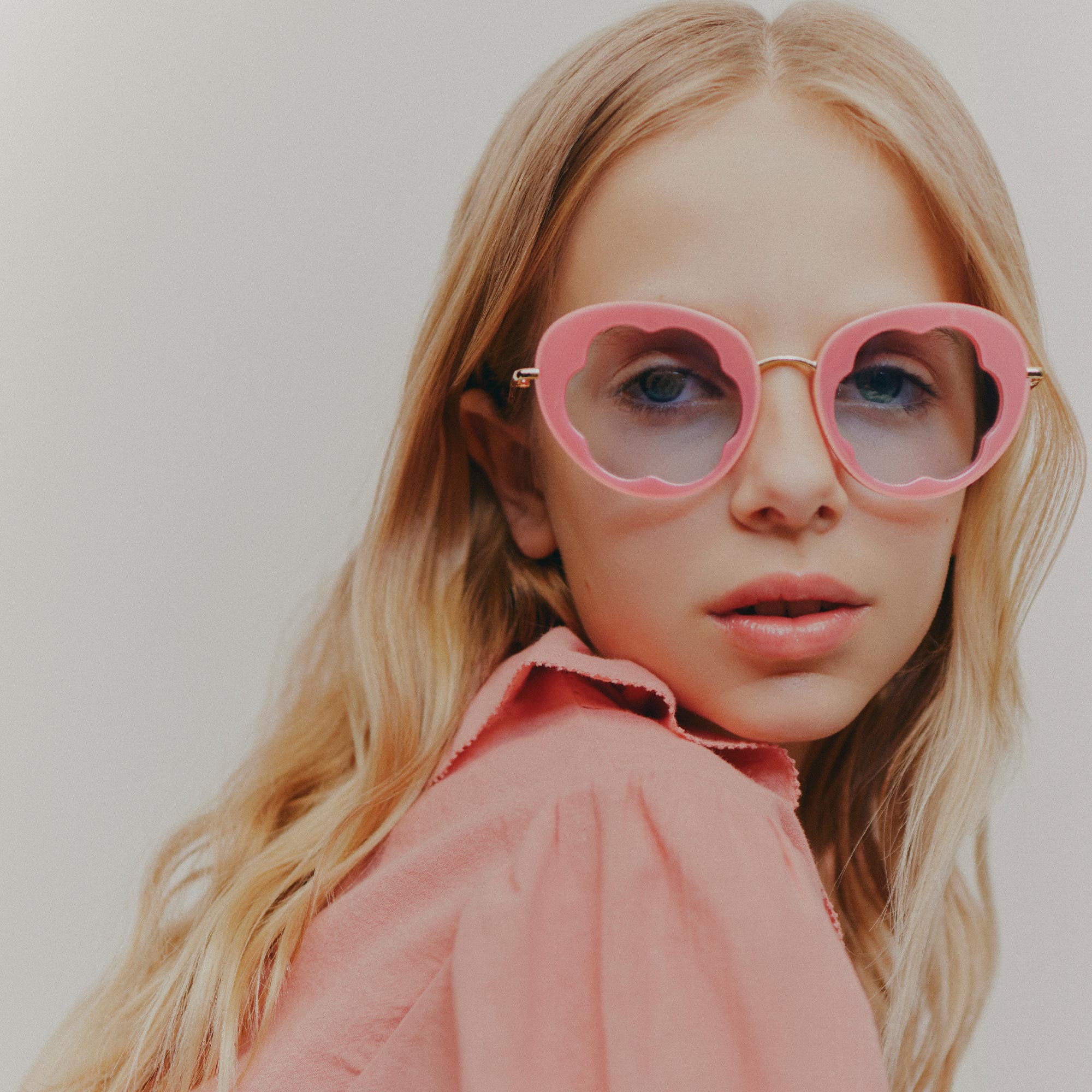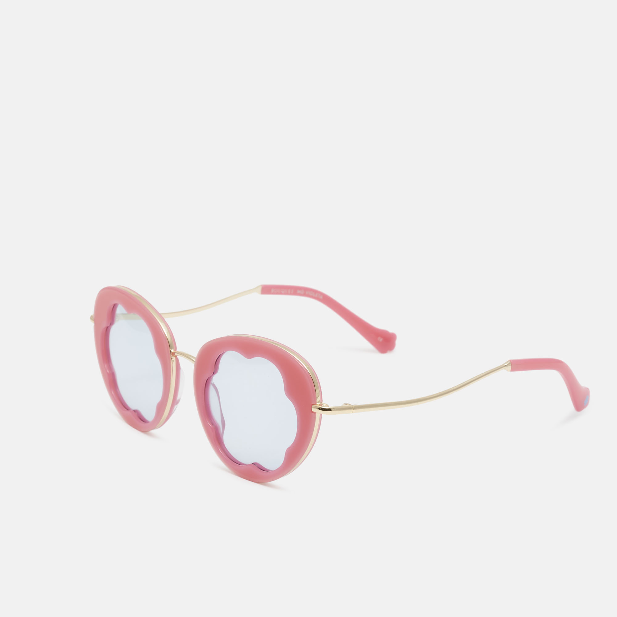 Gafas "kids" diseñadas en acetato rosa, con forma cat-eye y puente de metal. Tiene silueta de flor en su interior. Destaca la forma sinuosa de la varilla metálica con forma de tallo de planta. La lente de color turquesa le ofrece un aspecto más diverdo.