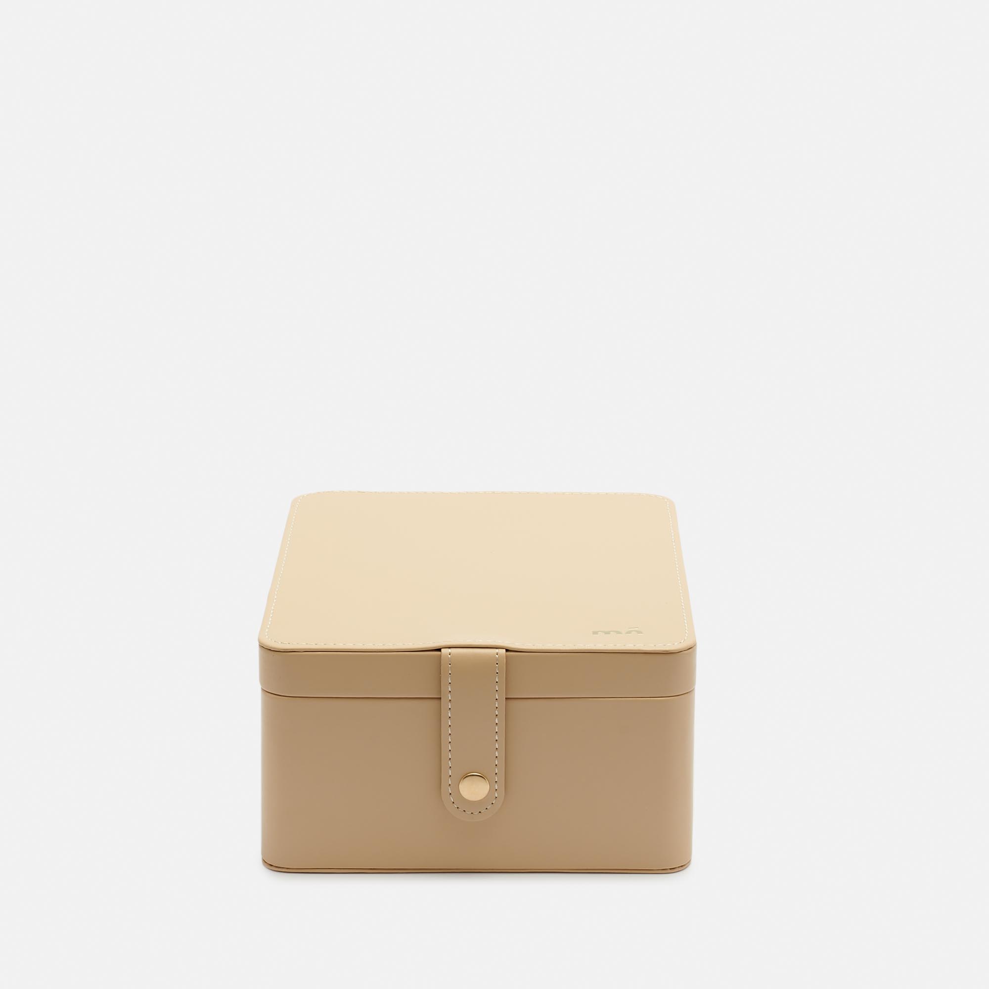 Estuche de viaje, en polipiel color beige con acabados dorados, compartimentado en dos alturaspara guardar hasta 6 gafas MÓ, tanto de sol como de vista. Su interior acabado suave mantendrá tus gafas protegidas de rayaduras y golpes, viene con una gamuza a juego para limpiar las lentes.