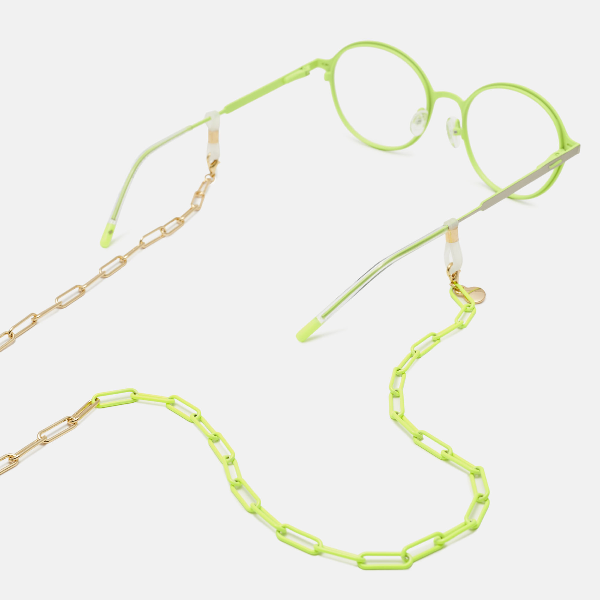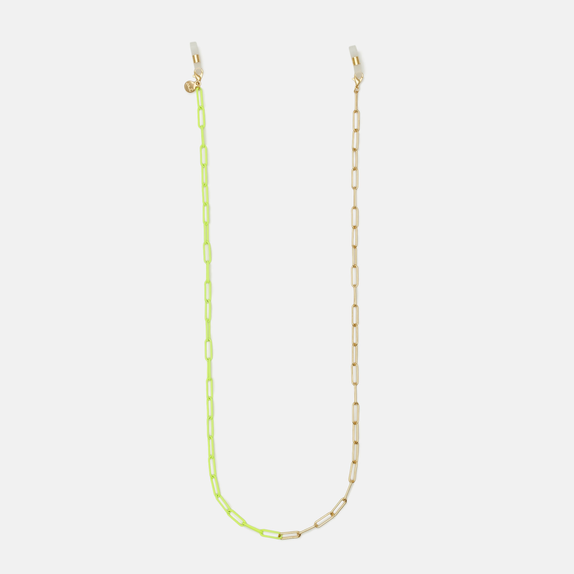 Exclusiva cadena de latón dorada con esmalte amarillo, un diseño muy en tendencia, combina con cualquier tipo de gafa, tanto de ver como de sol.Además de cuelga gafas, también se puede lucir como accesorio. Para ello, basta con retirar las gomas de los extremos y usar los mosquetones como cierre de tu nueva pulsera o collar..¡Aprovecha todas sus posibilidades!