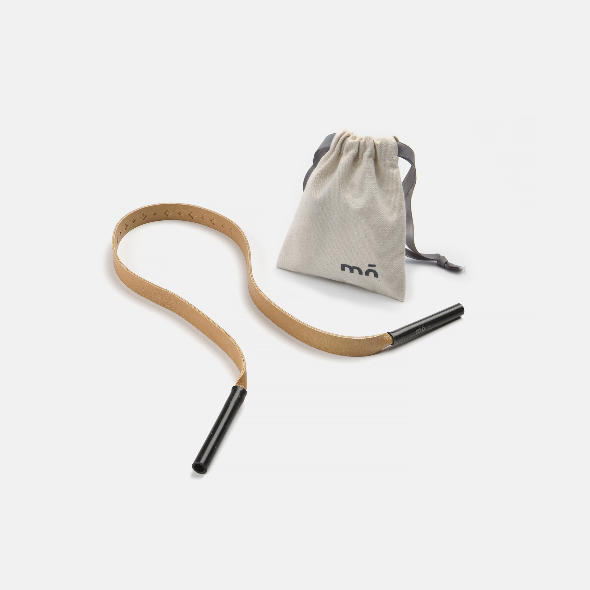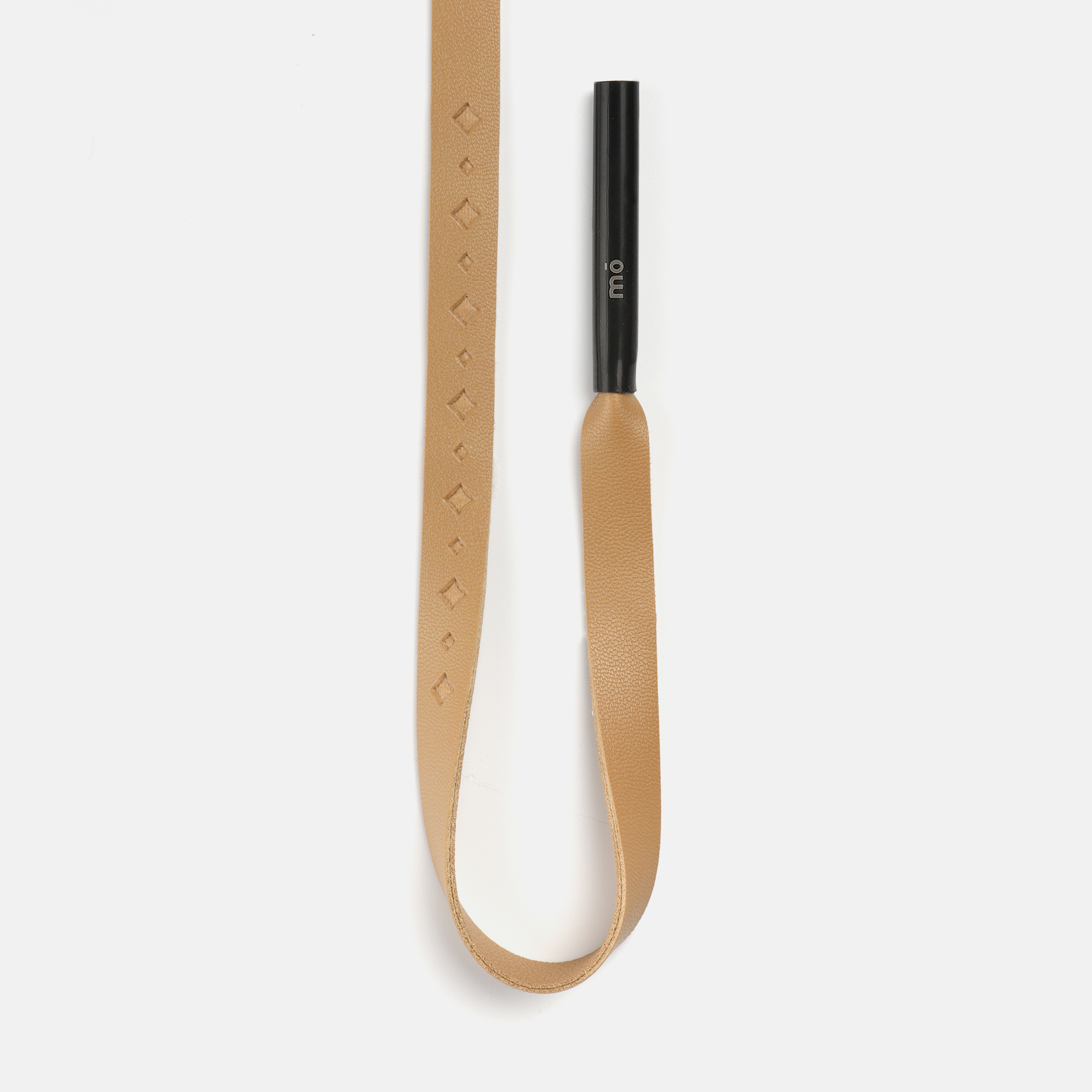 Cordón plano de cuero sintético en tono camel. Su original diseño incluye un estampado de rombos en relieve y un terminal de goma.