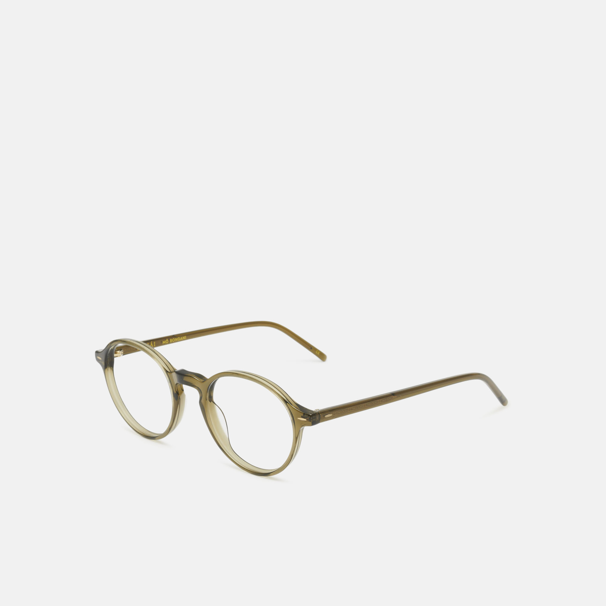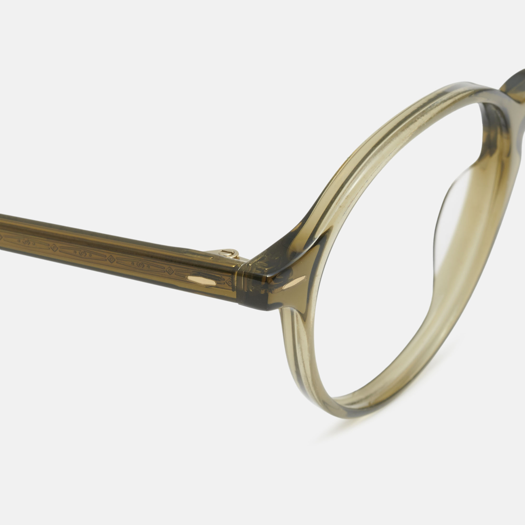 Gafas de ver unisex con montura redondeada, que evocan al estilo clásico pero contemporáneo.Su acetato color verde oliva de espesor fino, aportan ligereza a este diseño. Destacan los detallesmetálicos en color dorado en el frente y en la varilla, y el toque metálico interior con grabadoúnico.