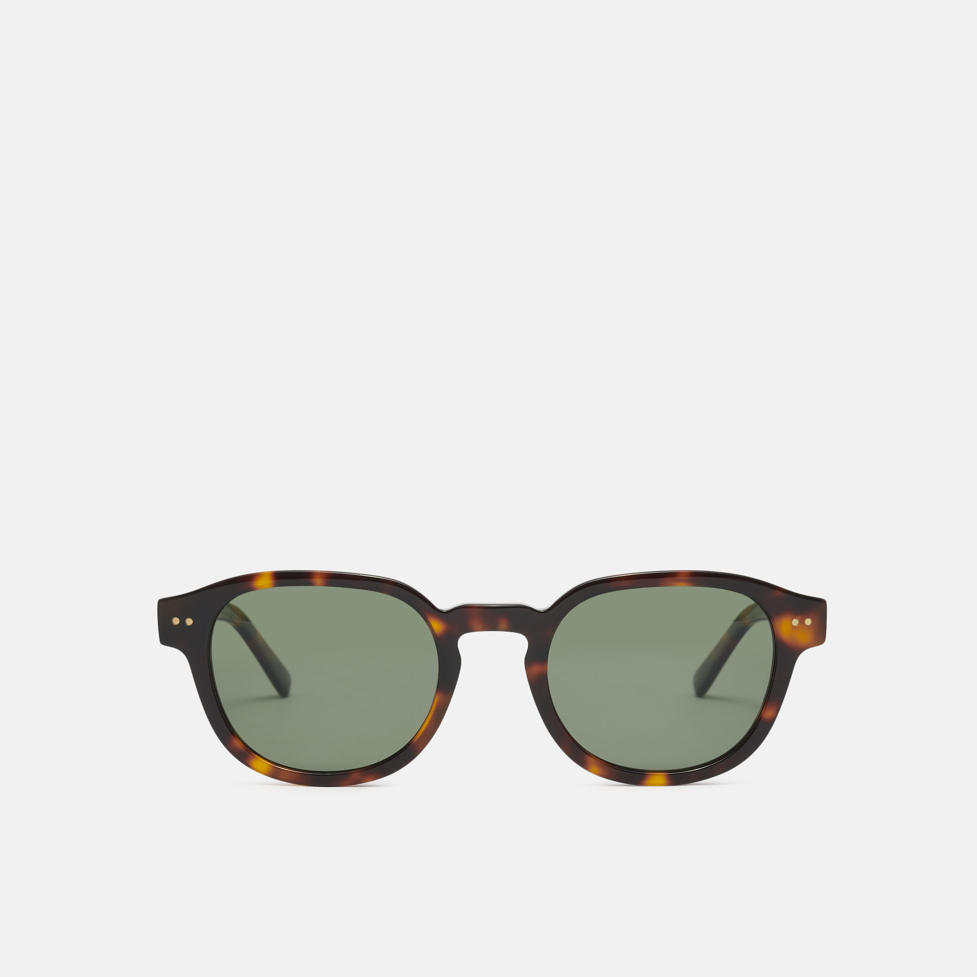 Gafas de sol de acetato carey con forma cuadrada y decoraciones metálicas en frente y varillas. Sus lentes verdes polarizadas de alta calidad, proporcionan una visión más nítida y un mejor contraste.