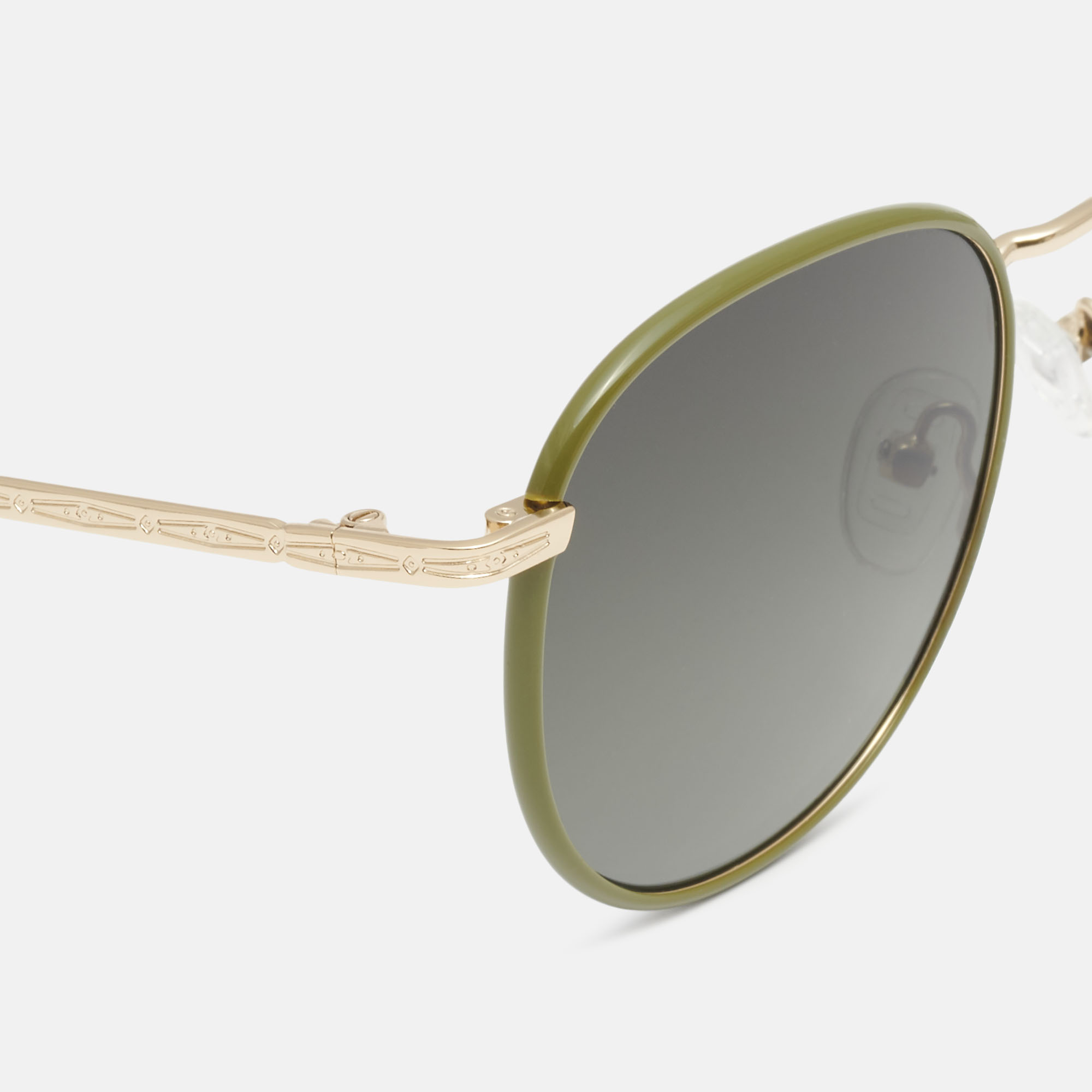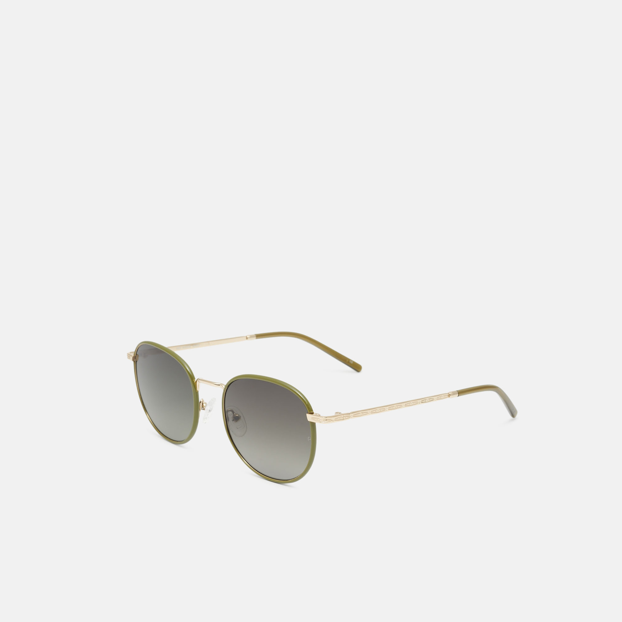 Gafas de sol para hombre con montrua redondeada, fabricadas en metal color plateado con arosen color verde oliva y lentes polarizadas color verde degradado. Deestaca el estampadolabrado de las varillas.
