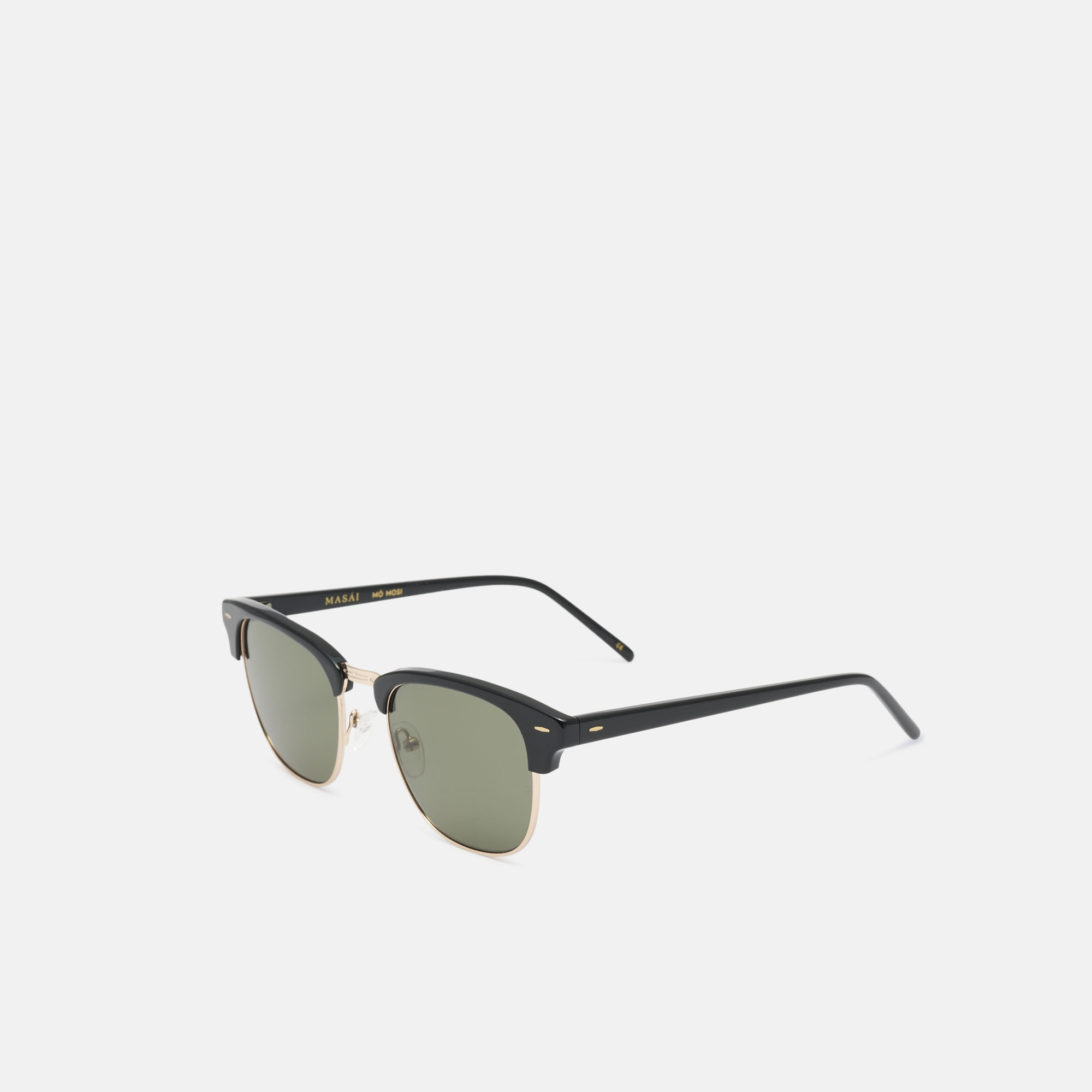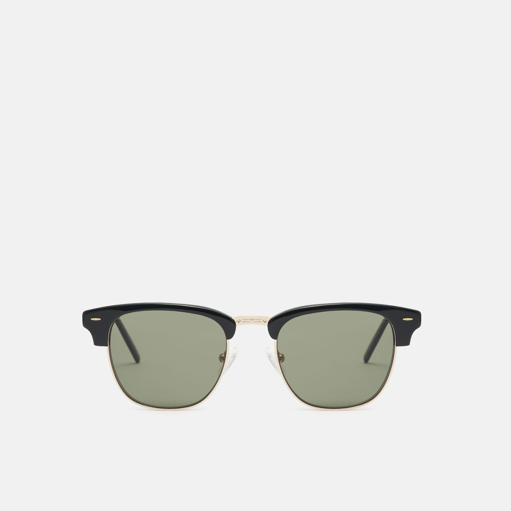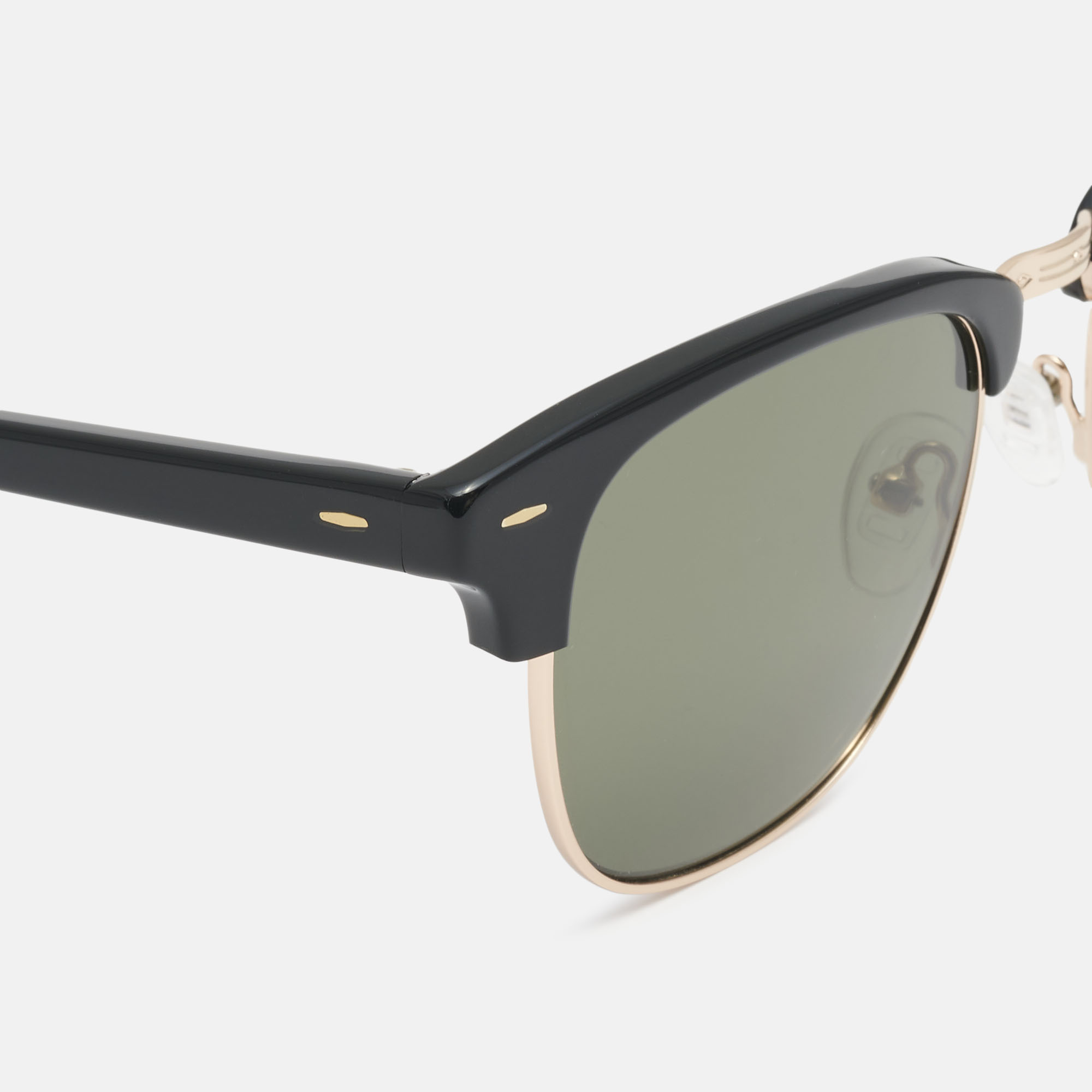Gafas de sol unisex con montrua cuadrada, fabricadas con acetato color negro y metal colordorado y con lentes polarizadas color verde. Destaca el labrado interior de las varillas y susdetalles metálicos.