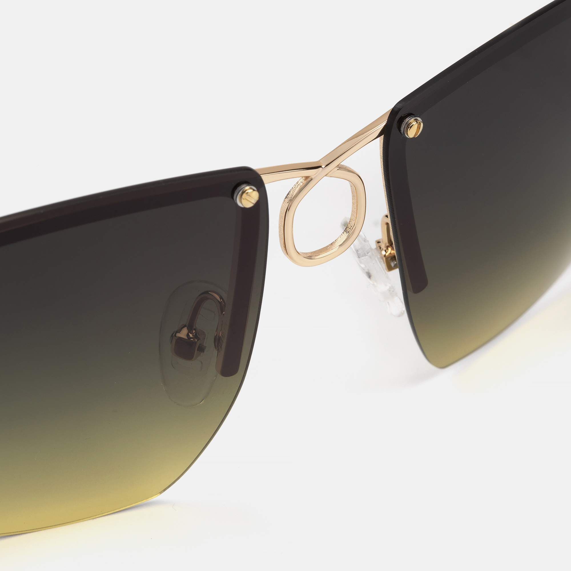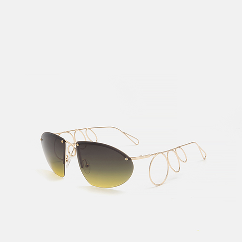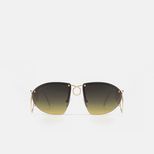 Gafas de sol creadas en colaboración con el diseñador Alejandro Palomo, de PALOMO SPAIN. El modelo MÓ RYTAS tiene una forma de lente orgánica en colores degradados, destaca la forma imposible de las varillas “loop” que enfatiza el look post futurista. Este modelo incluye un estuche en formato "mini bolso" de terciopelo, su correa sirve también de cordón para gafas.