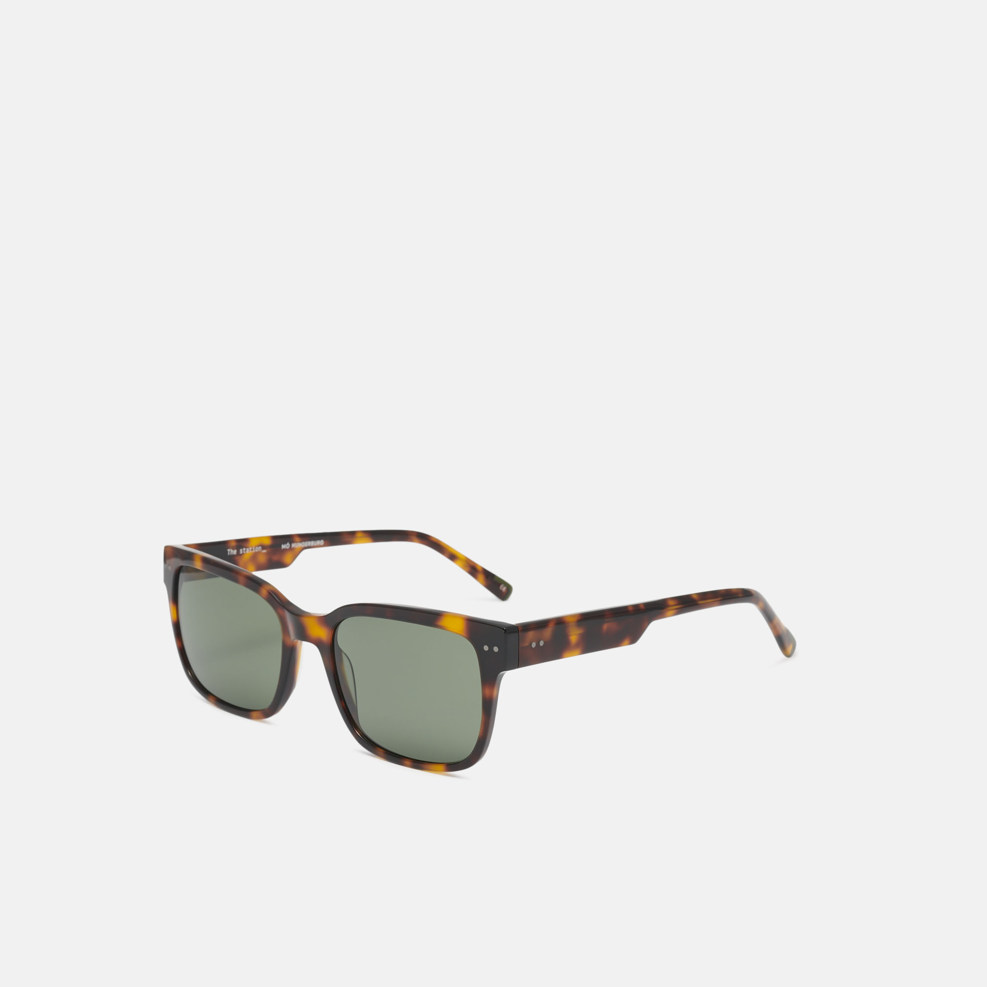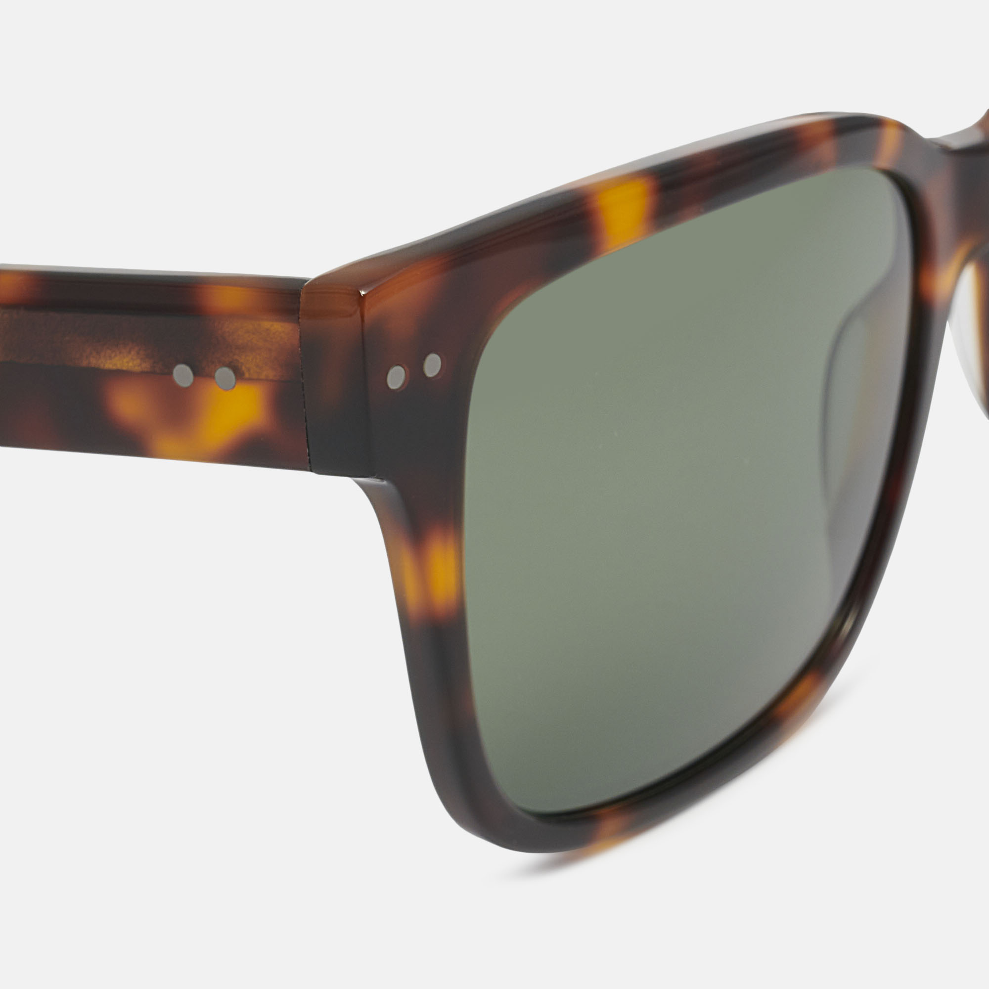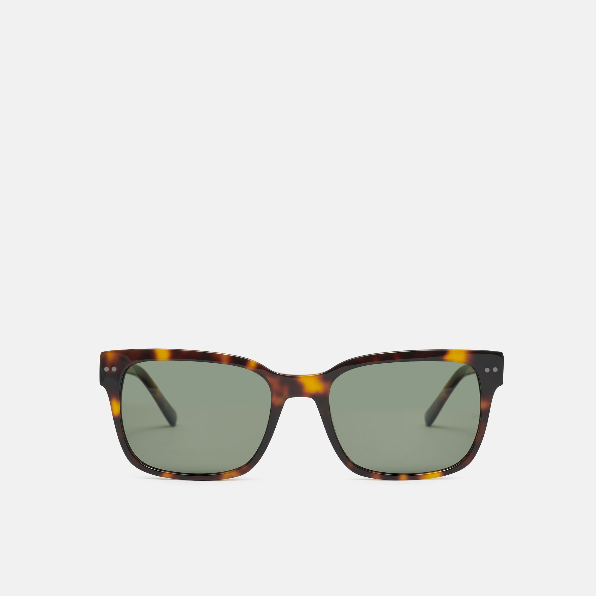 Gafas de sol de acetato carey con forma cuadrada y decoraciones metálicas en frente y varillas. Sus lentes verdes polarizadas de alta calidad, proporcionan una visión más nítida y un mejor contraste.