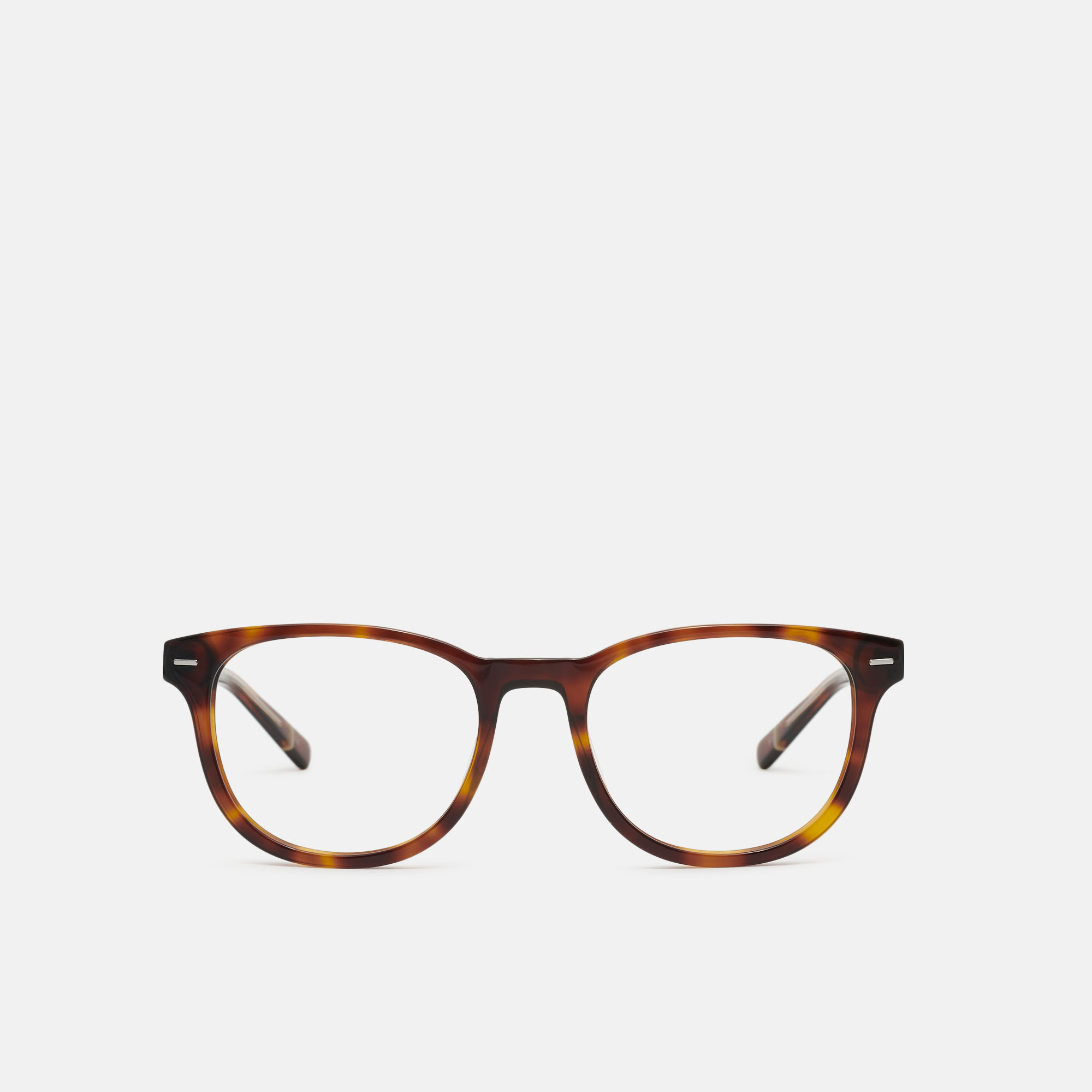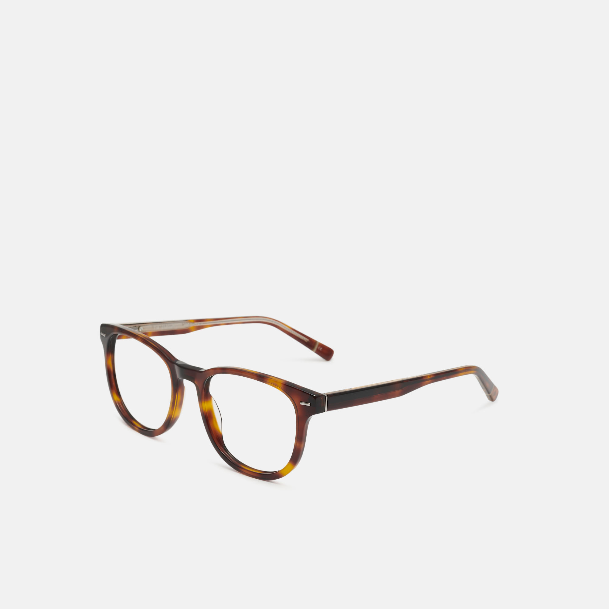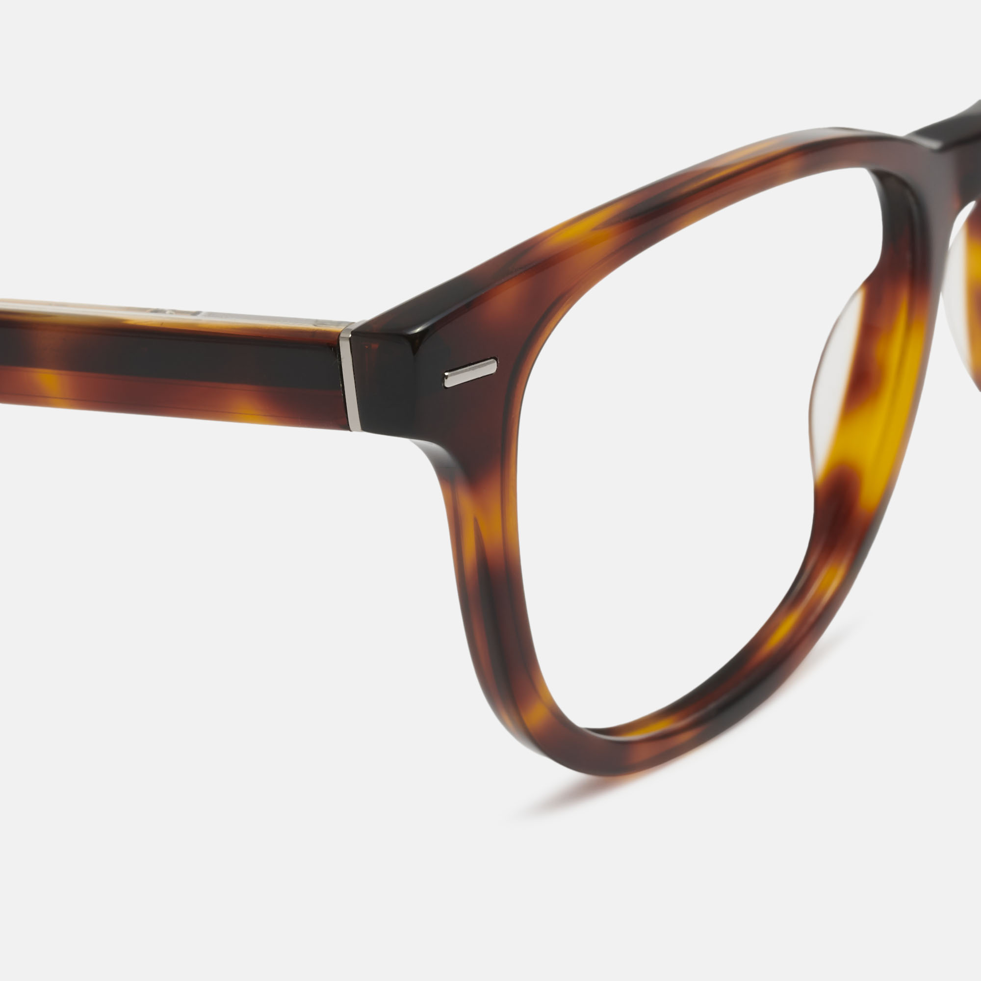 Gafas de acetato carey con forma cuadrada y decoraciones metálicas en el frente.