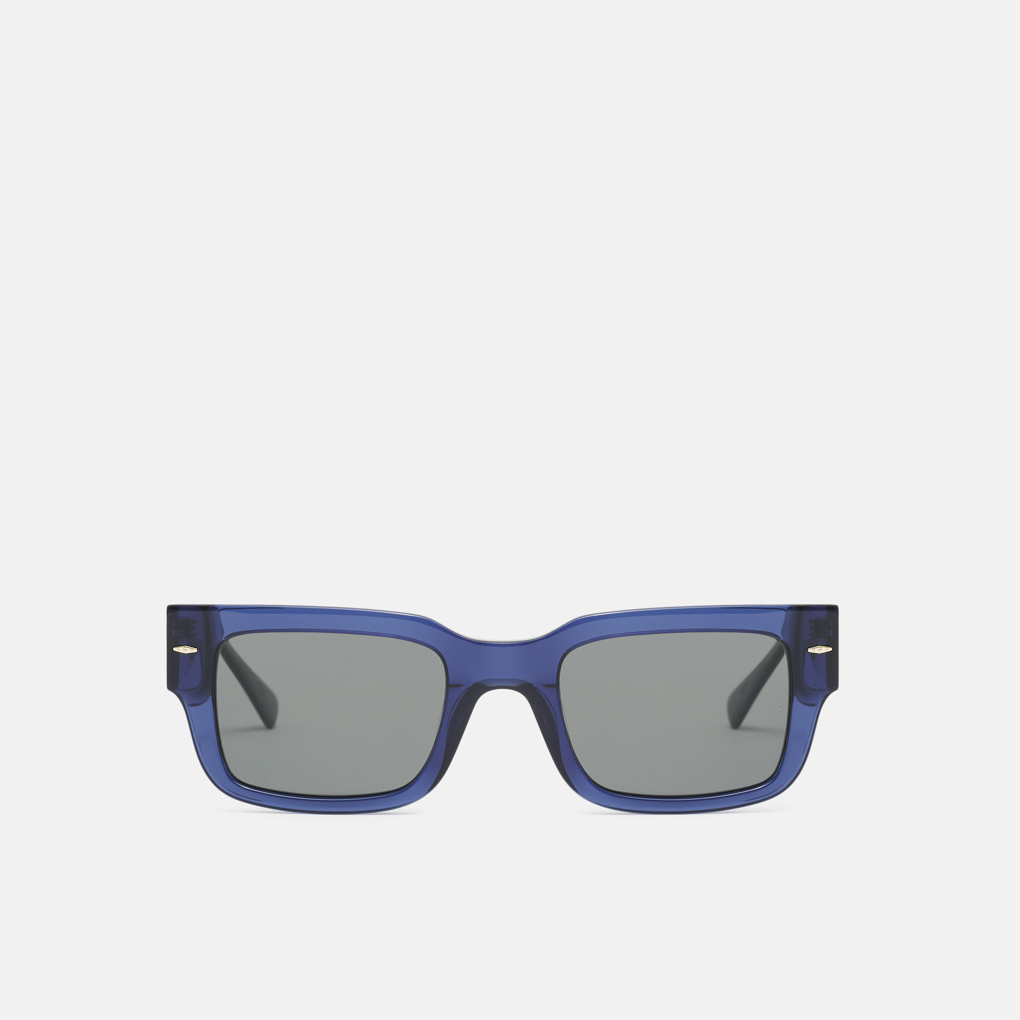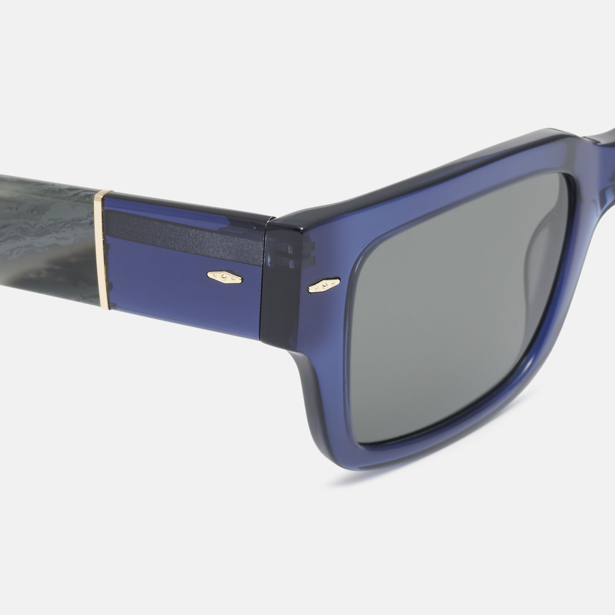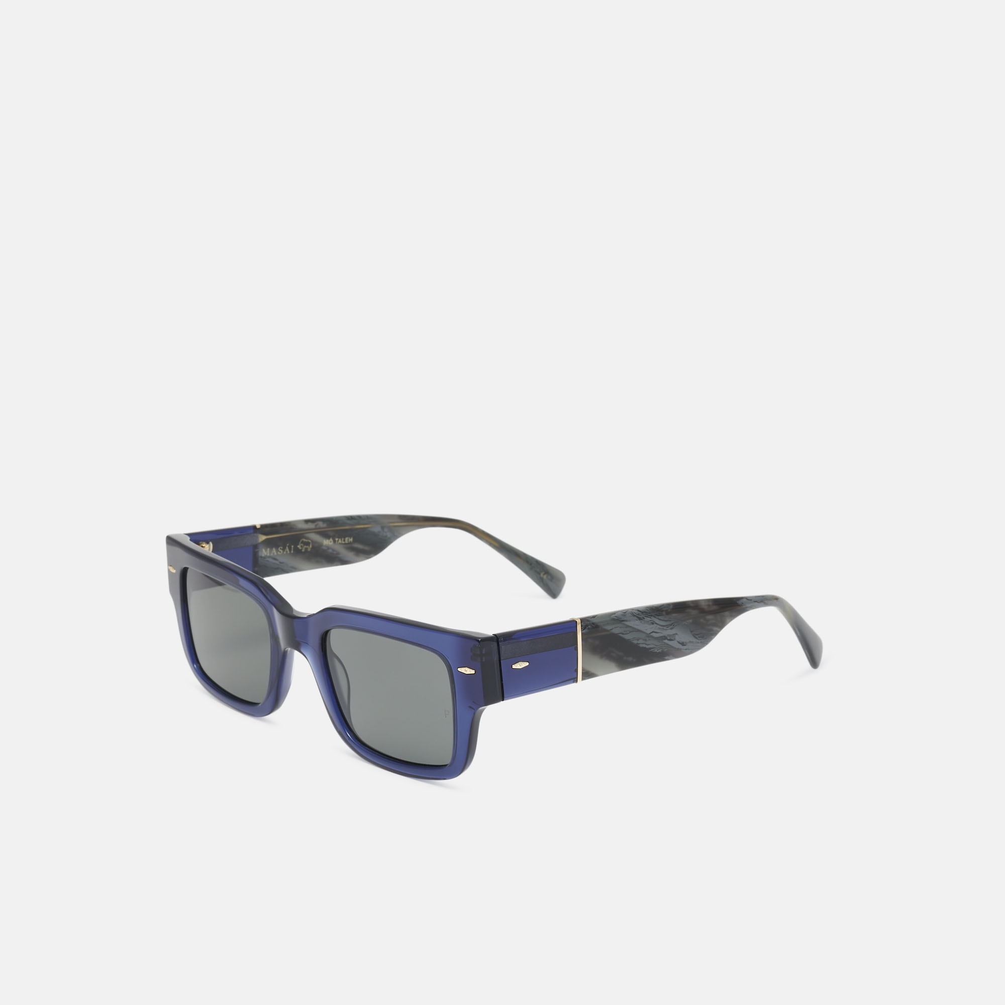 Gafas de sol para hombre con montura rectangular, fabricadas en acetato color azul en el frontaly pattern gris en la varilla, y con lentes polarizadas de color gris. Destacan los detalles metálicos que aportan elegancia y sofisticación.