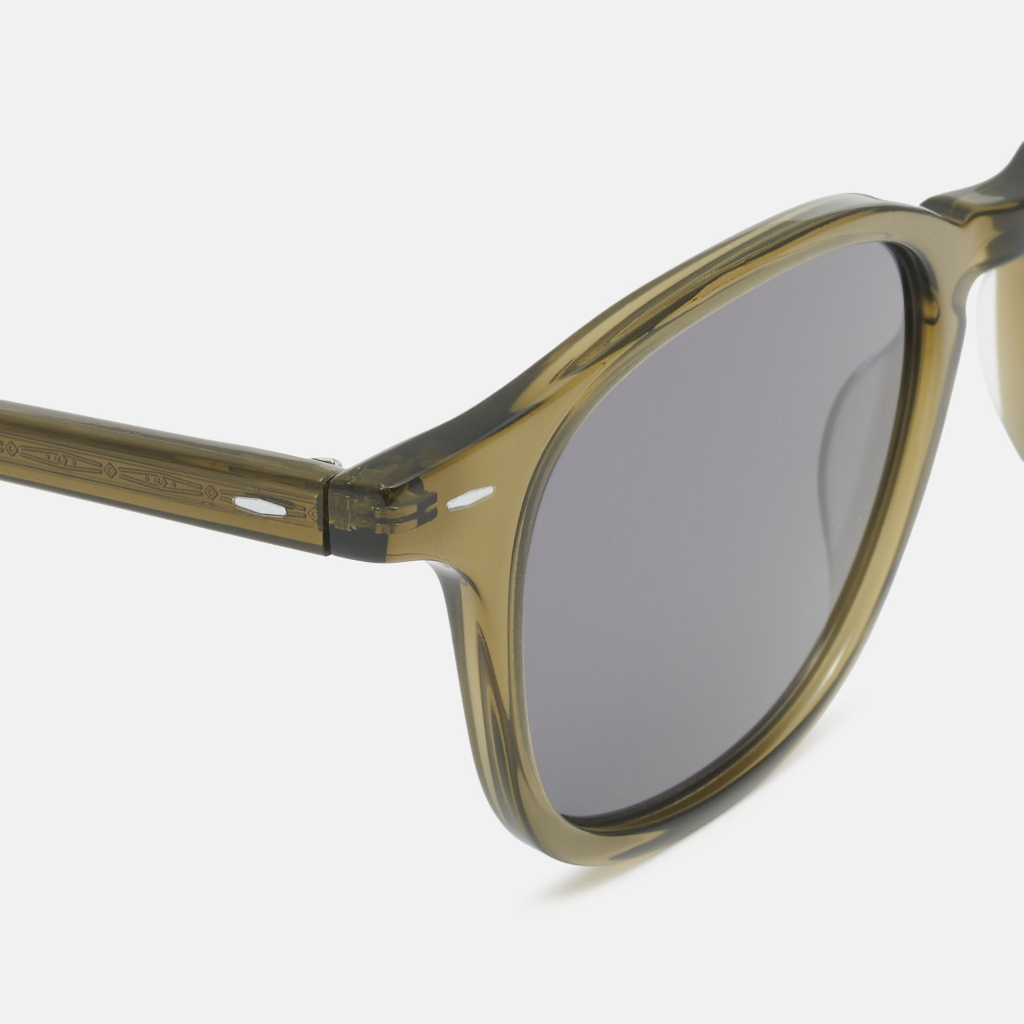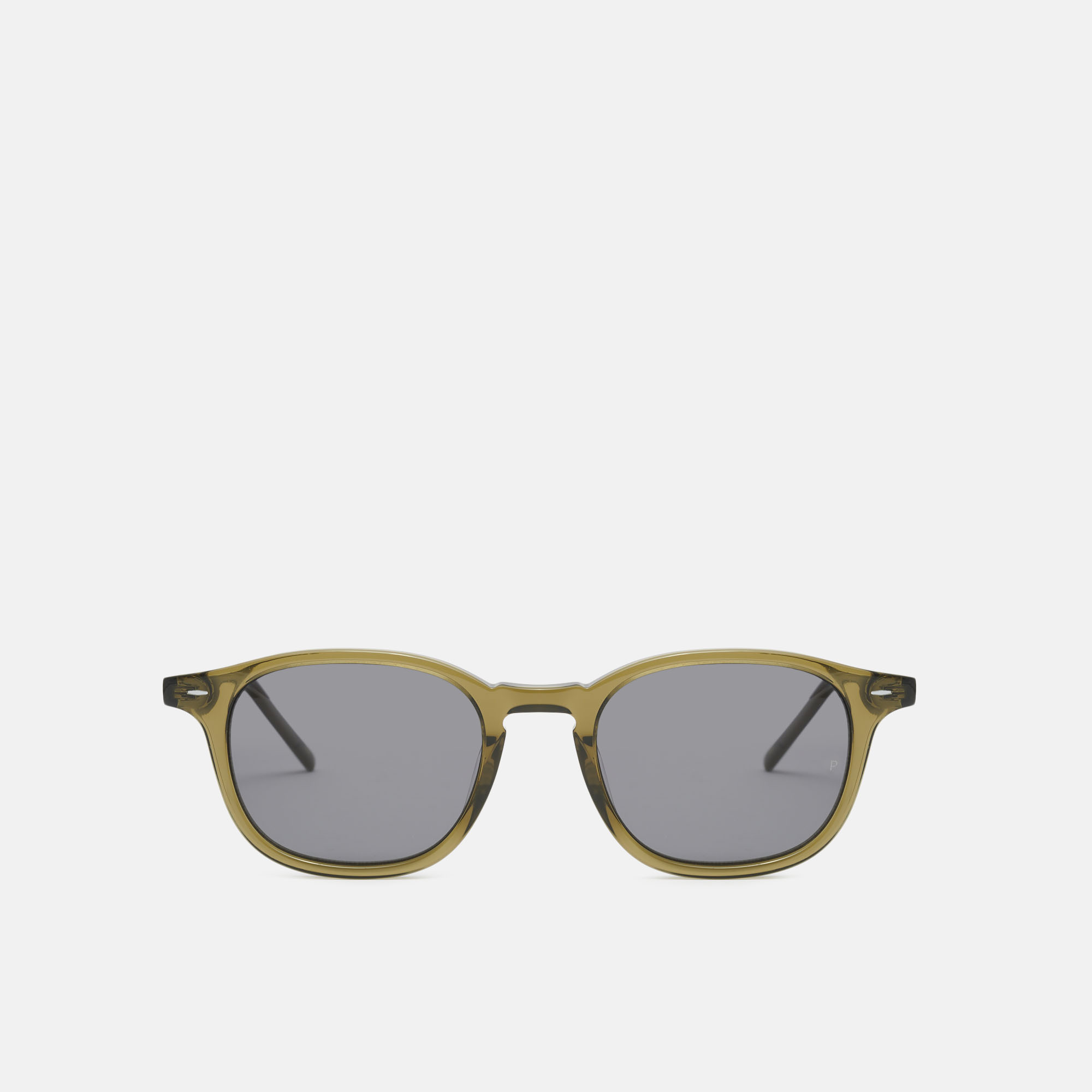 Gafas de sol para hombre con montura cuadrada, fabricadas de acetato color verde olivay con las lentes color gris. Destaca el detalle metálico interior con estampado tribal y losdetalles metálicos en el frente y en las varillas