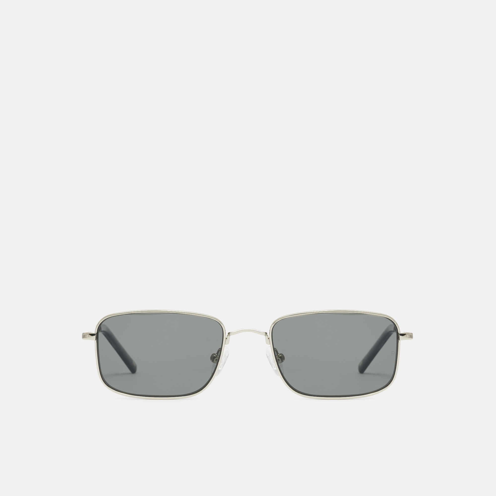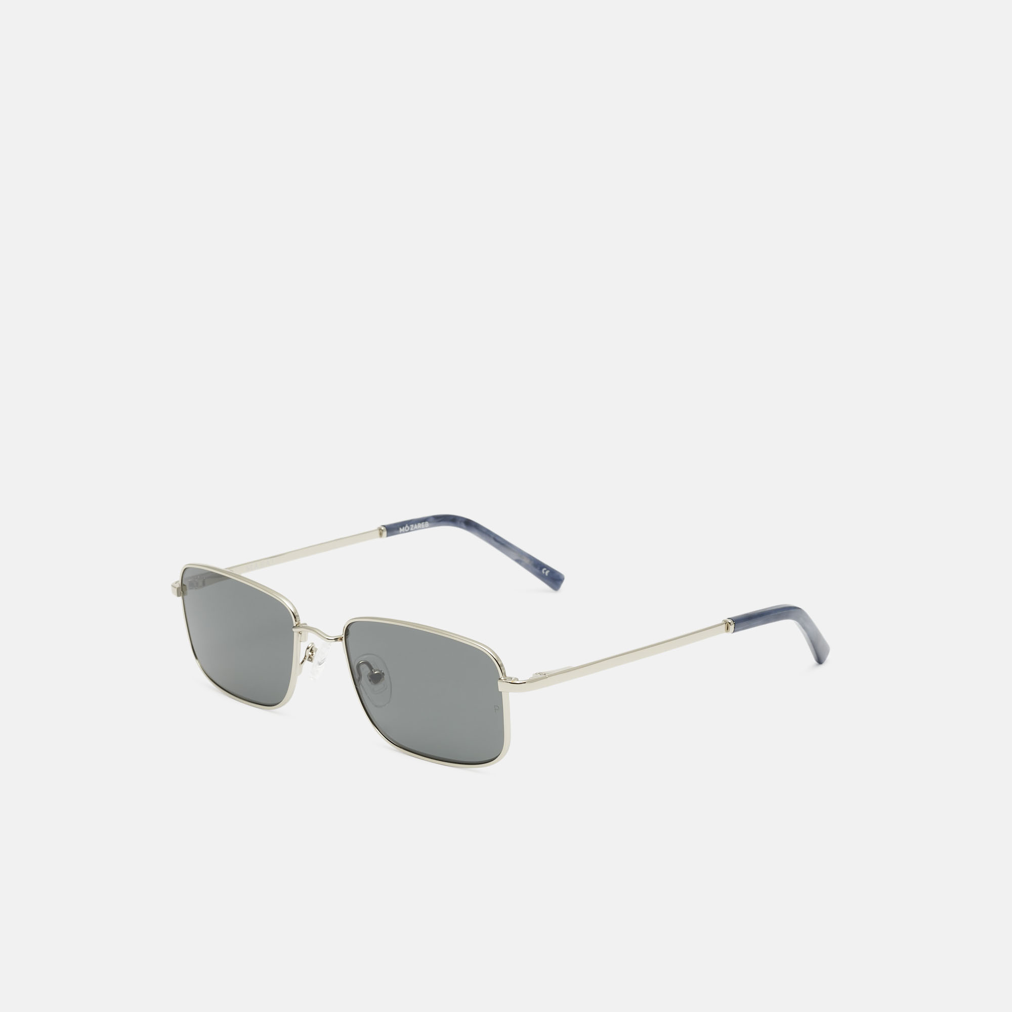 Gafas de sol de hombre fabricadas en metal plateado con montura rectangular y lentes polarizadas en color gris. La varilla cuenta con detalles en color azul que aportan elegacia y sofisticación a este modelo.
