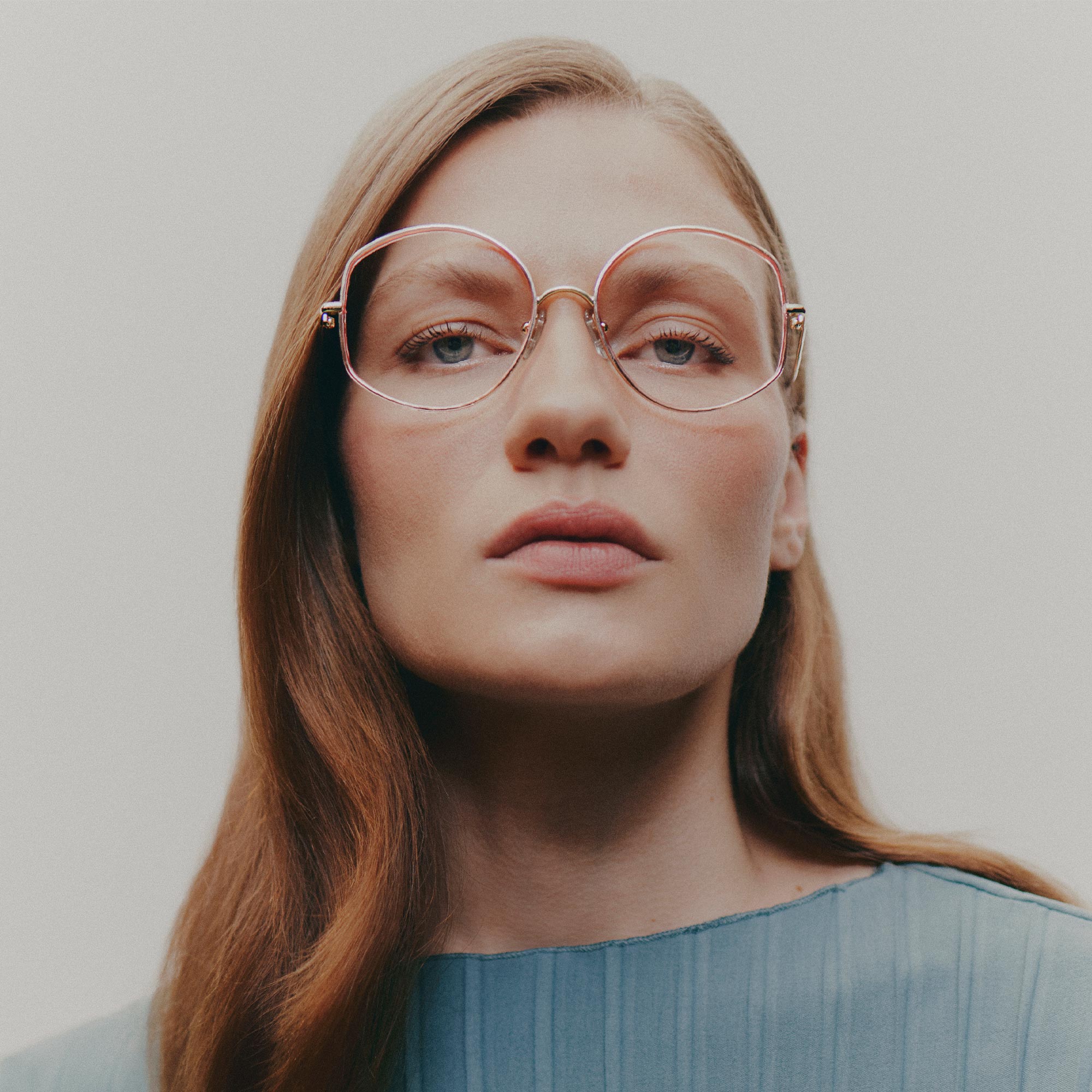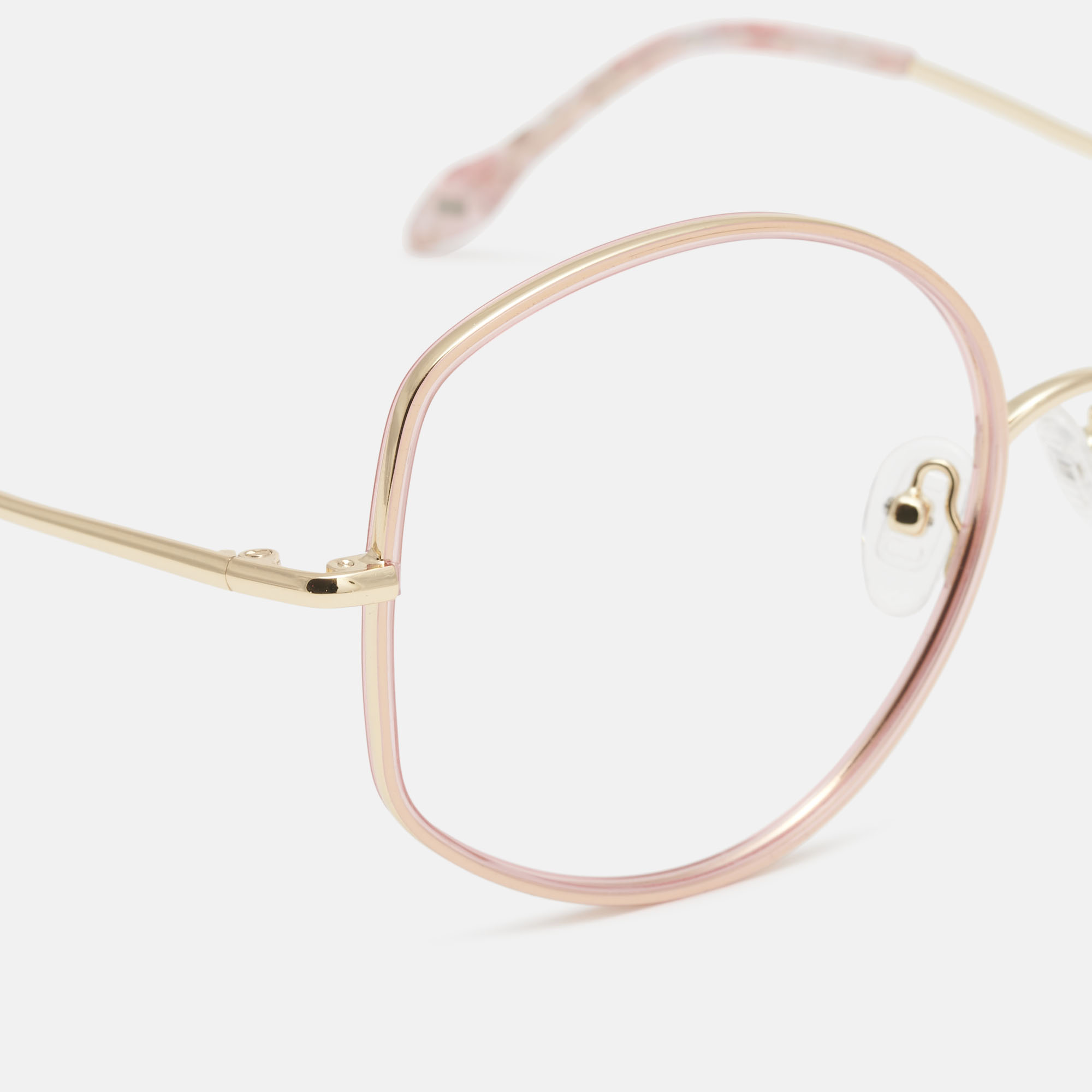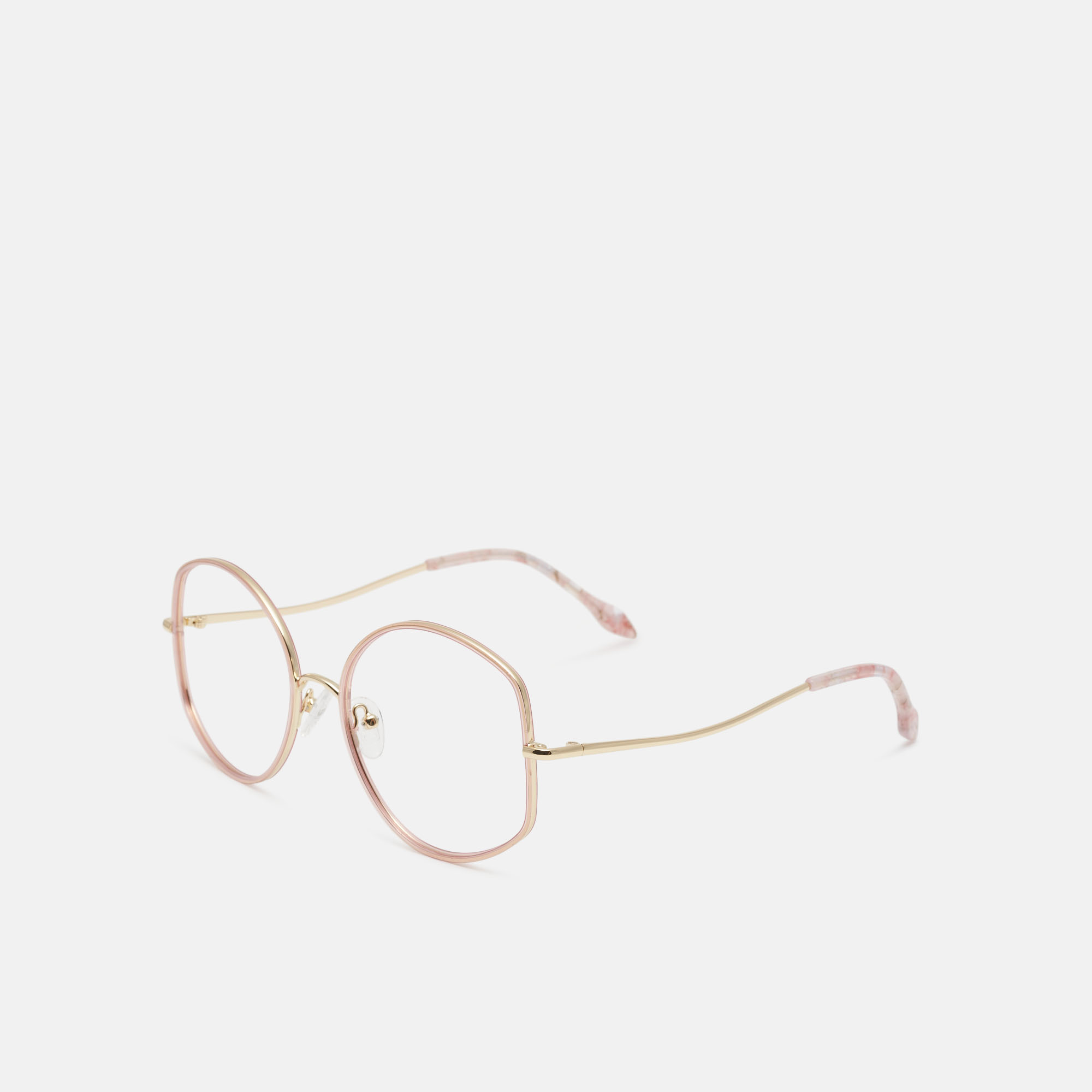 Gafas con forma "oversize", para mujer, de metal dorado recubierto con aros de acetato rosa, destaca la varilla sinuosa en forma de tallo de planta.