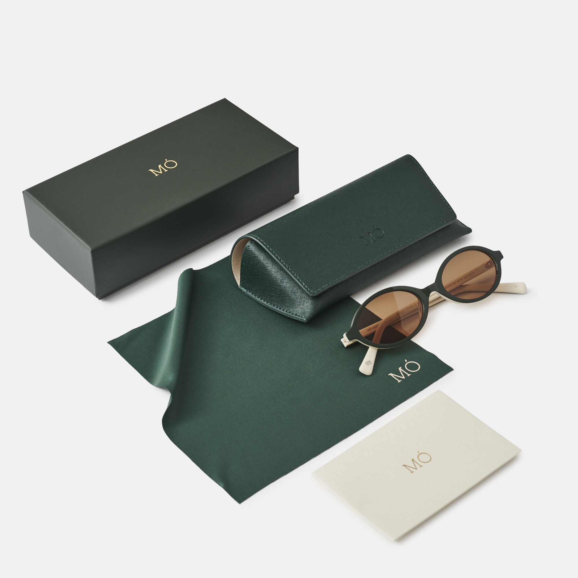 Gafas de sol para mujer, de la cápsula Mó x Maison Matcha, con forma ovalada minimalista.Predomina el acetato verde en el exterior y beige en el interior con varilla adornada con detallemetálico dorado. Sus lentes verdes degradadas de alta calidad son polarizadas, para unamejor protección y confort.