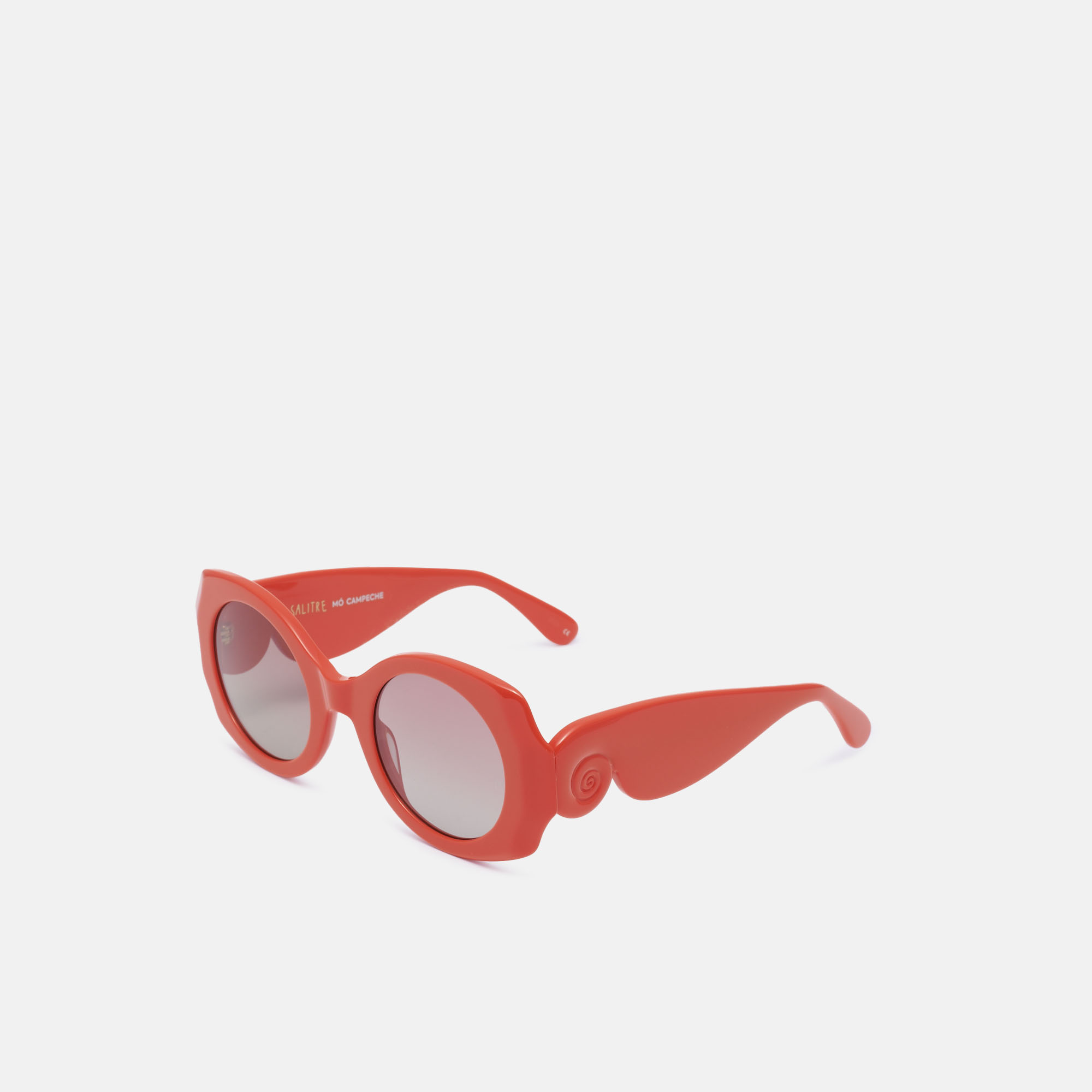 Gafa de sol de mujer con forma ovalada y figura orgánica. El espesor del acetato, las formas marinas del frente y varilla que recuerdan a las conchas hacen de este modelo una gafa muy especial. Perfecta para quienes se divierten con las gafas.