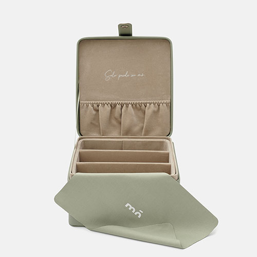 Estuche de viaje, en polipiel color verde con acabados plateados, compartimentado en dos alturas para guardar hasta 6 gafas MÓ, tanto de sol como de vista. Su interior con acabado suave mantendrá tus gafas protegidas de rayaduras y golpes, viene con una gamuza a juego para limpiar las lentes.