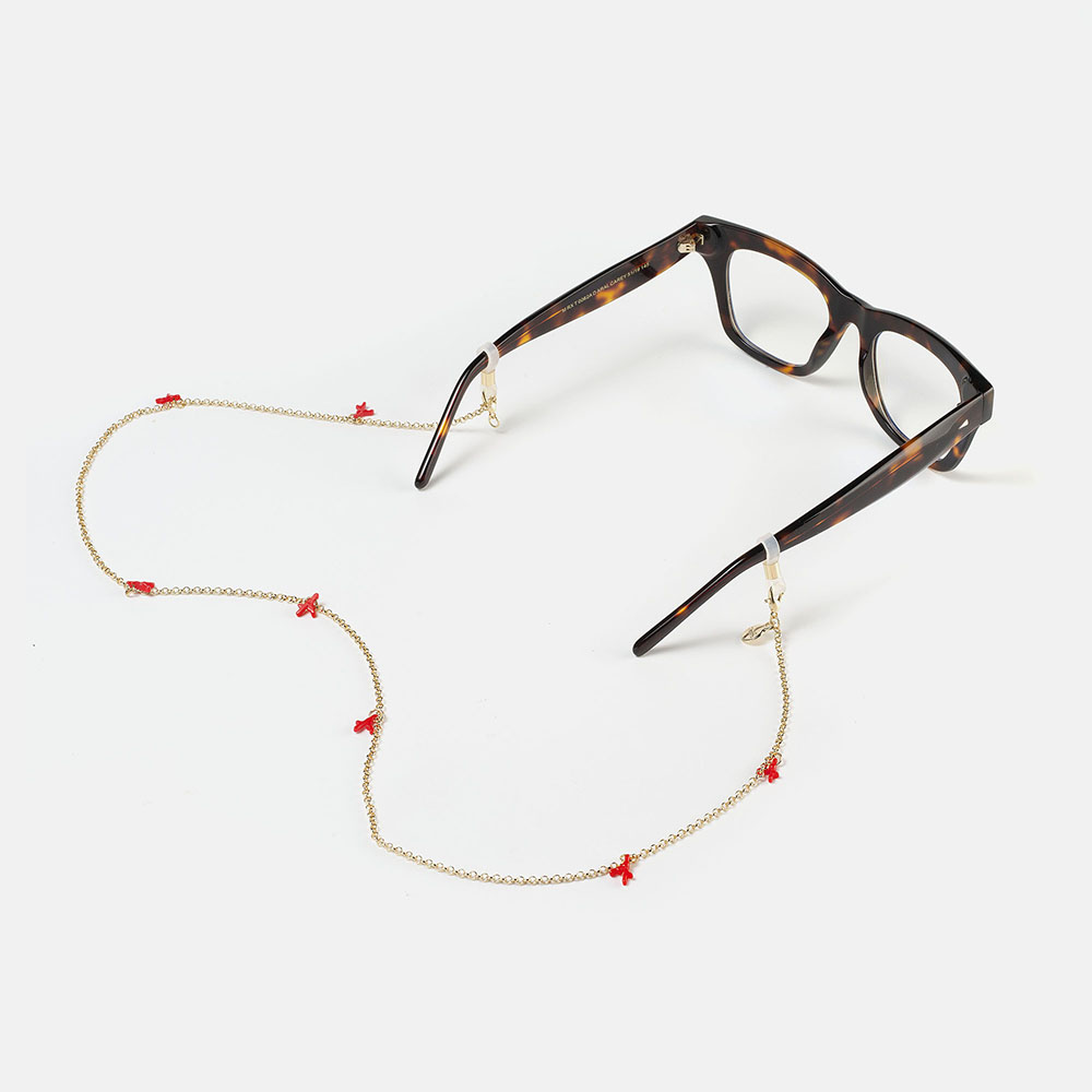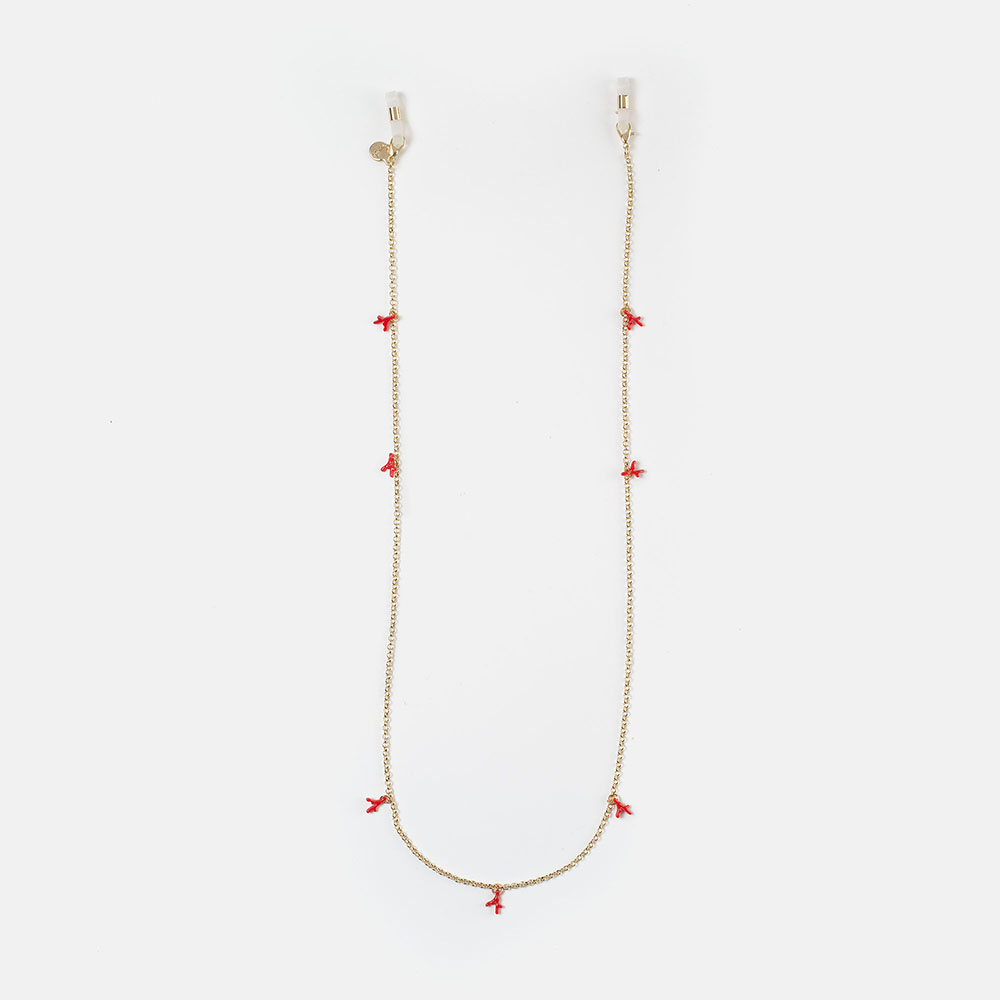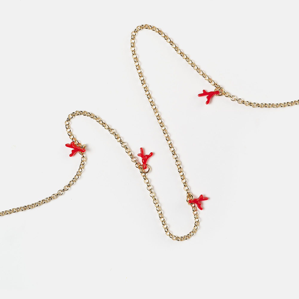 Cordón de cadena dorada con corales colgantes. Gracias a sus mosquetones, se puede usar tambien de colgante o pulsera. Largo total: 70cm.