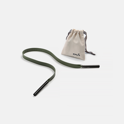 Cordón plano de cuero sintético en tono verde. Su original diseño incluye un estampado de rombos en relieve y un terminal de goma.