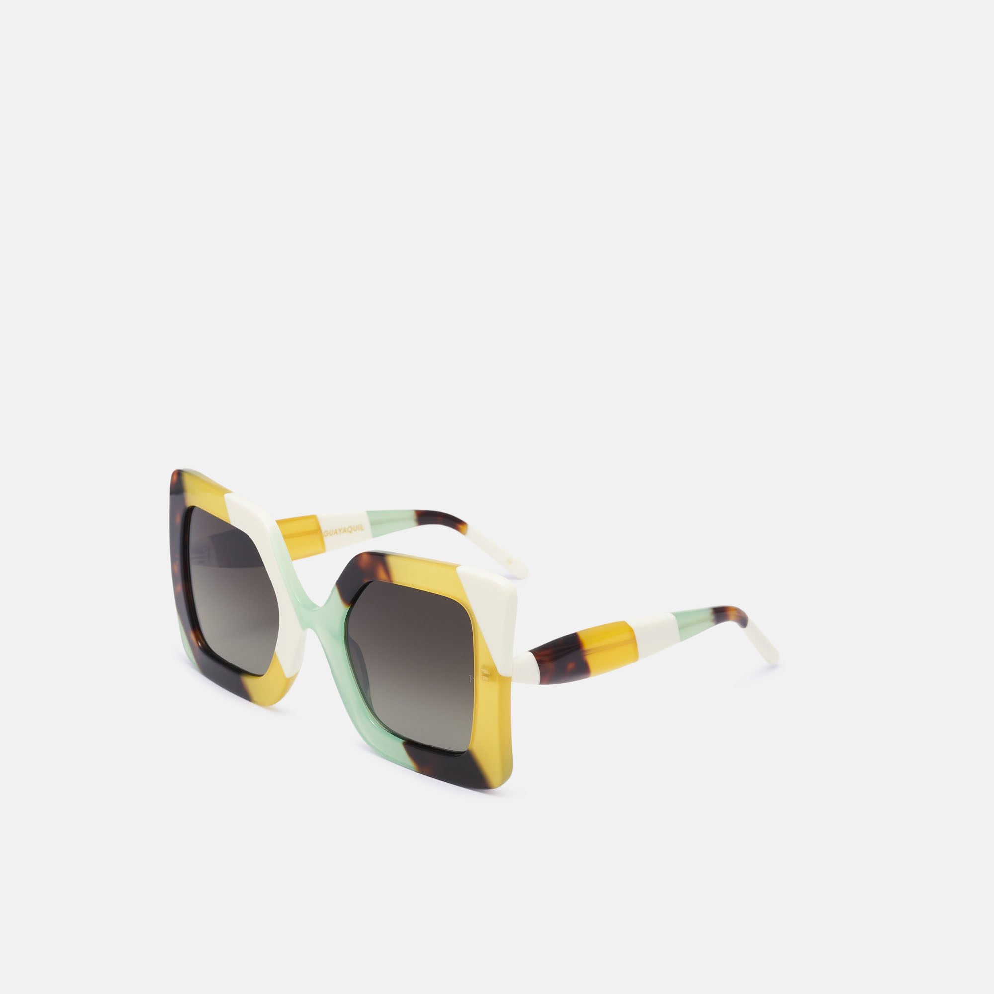 Gafa de mujer cuadrada de estilo oversize y muy sofisticada. Los ligeros picos de las esquinas, así como el espesor del acetato y las rayas de colores hacen de este modelo una gafa única con la que no pasar desapercibida.