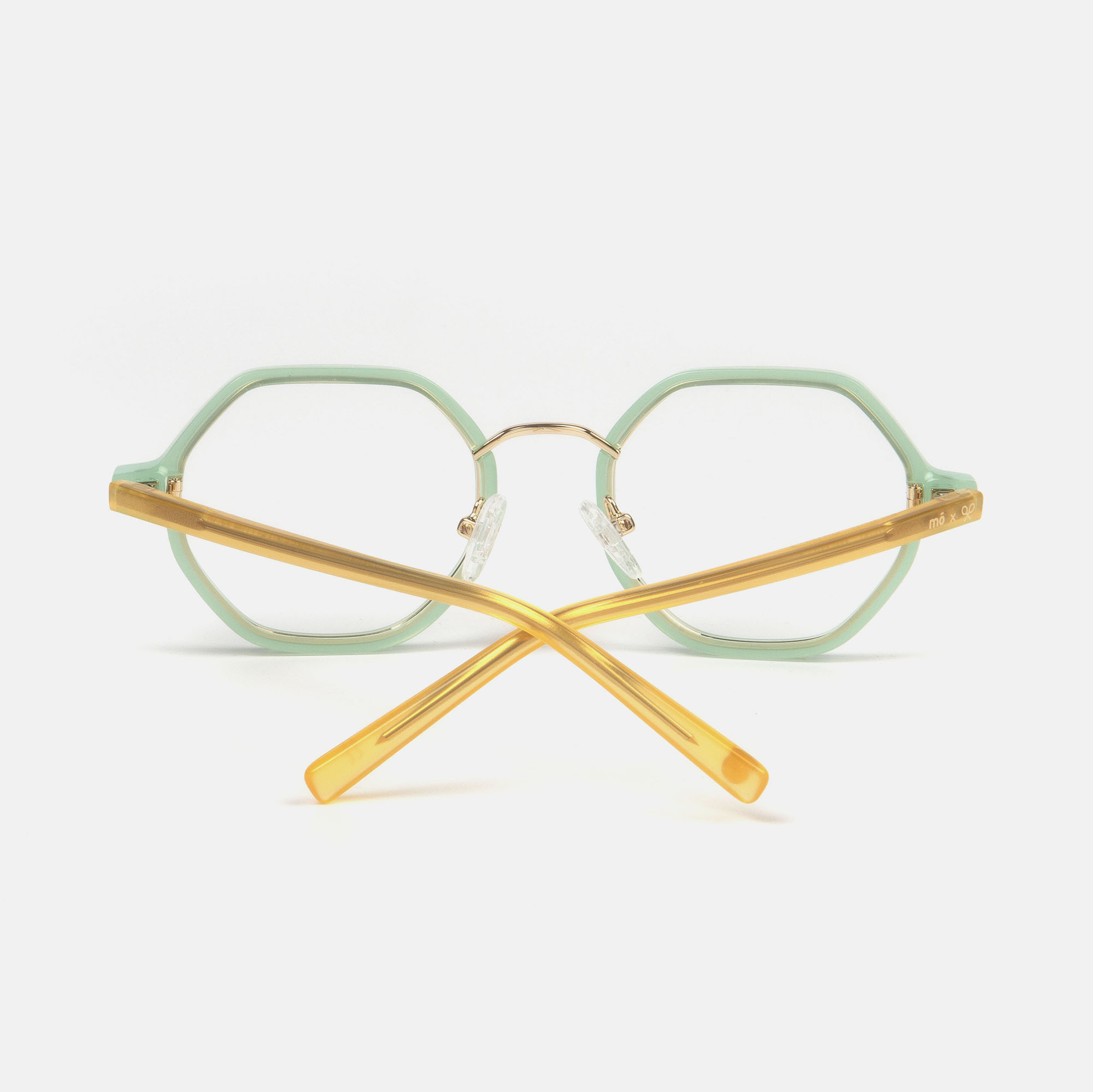 El modelo para niña Mó Milla de la colección de Kids de Mó x Silbon. Su montura geométrica hecha de acetato verde con puente de metal combina con sus lentes polarizadas y aporta sofisticación a este diseño perfecto para los más pequeños. Sus varillas en color amarillo tienen pequeños detalles metálicos con logo que completa este divertido diseño.