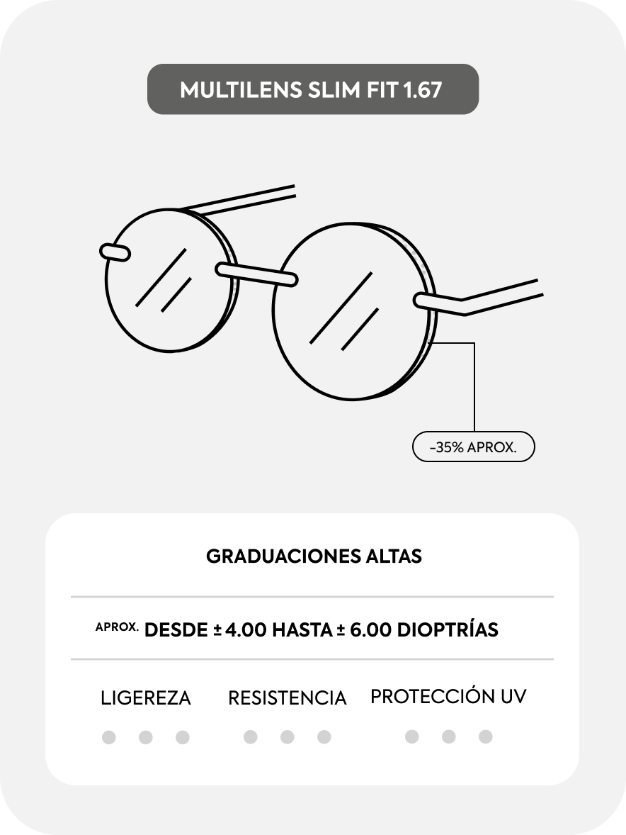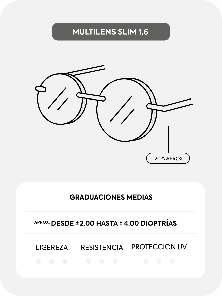 El grosor de las lentes aumenta cuanto mayor es la graduación, pero se puede reducir para conseguir lentes más finas y ligeras, que se adapten mejor a la montura y aporten comodidad. Además, las lentes reducidas son más resistentes a la rotura e incluyen filtro de protección UV.